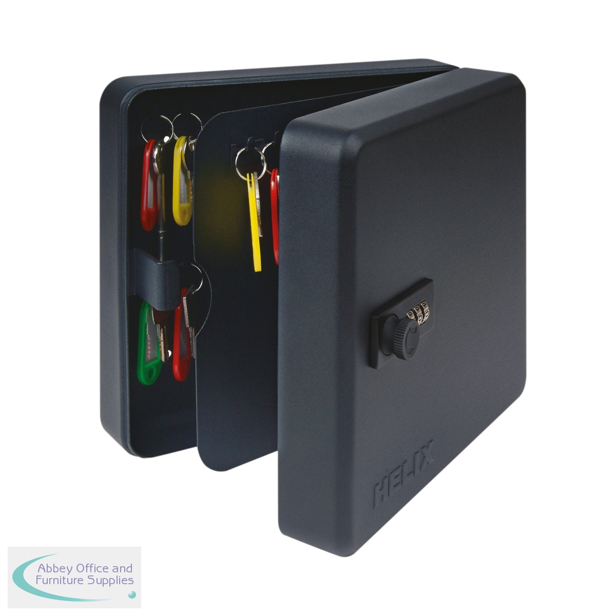 This Helix Key Safe features a metal combination lock to help keep keys secure. The safe features a durable steel construction with black powder coated finish and metal key hooks. Ideal for retail, this safe has a 50 key capacity and measures W235 x D80 x H215mm.