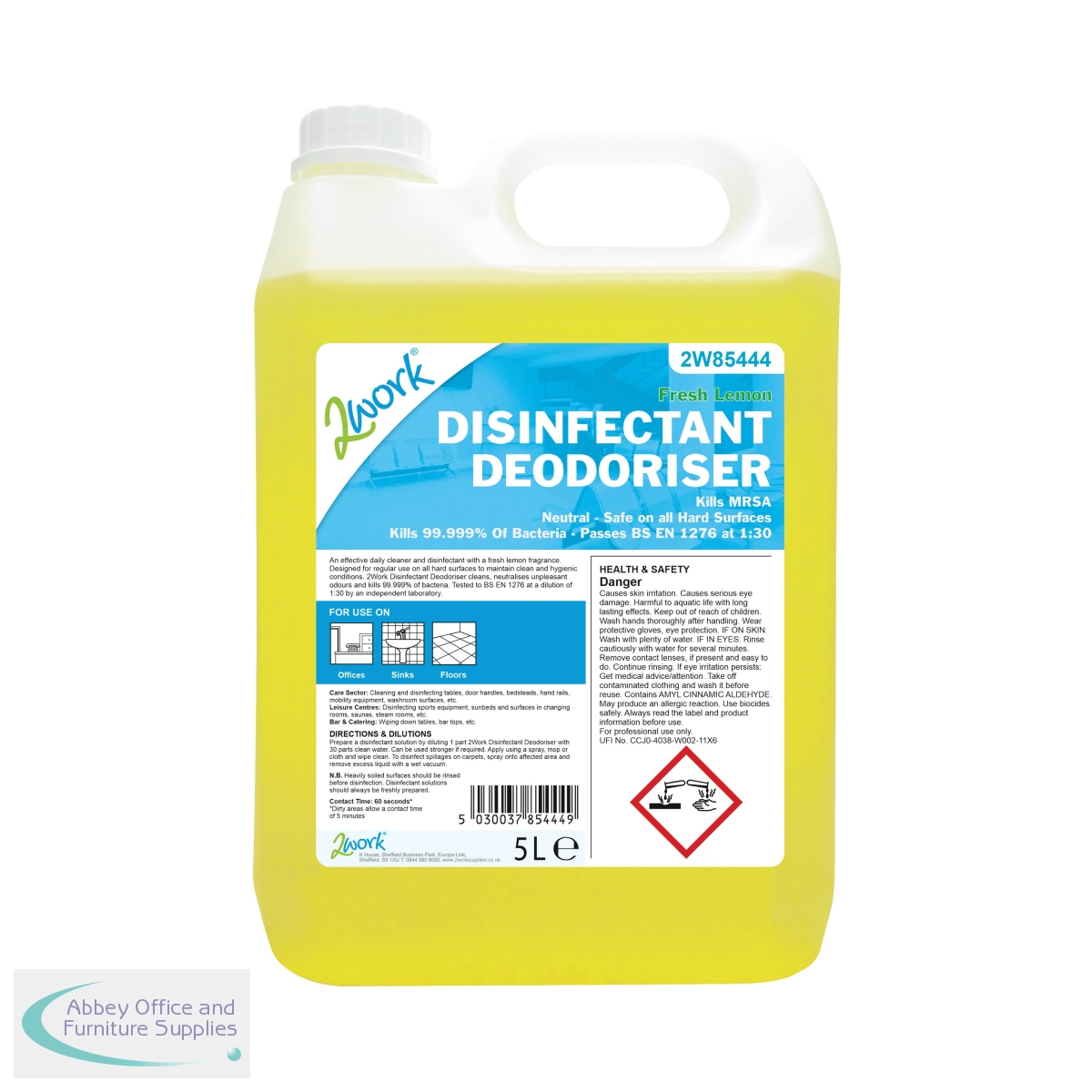 This 2Work bactericidal lemon cleaner is an effective daily cleaner and disinfectant that kills MRSA and 99.999% of bacteria. Designed for regular use to help maintain clean and hygienic conditions. Can be used safely on any water washable surface as it is a neutral product. Ideal for cleaning and disinfecting washroom areas, floors, rubbish bins, sunbeds, sports equipment and more. This pack contains one 5 litre bottle with a fresh lemon fragrance.