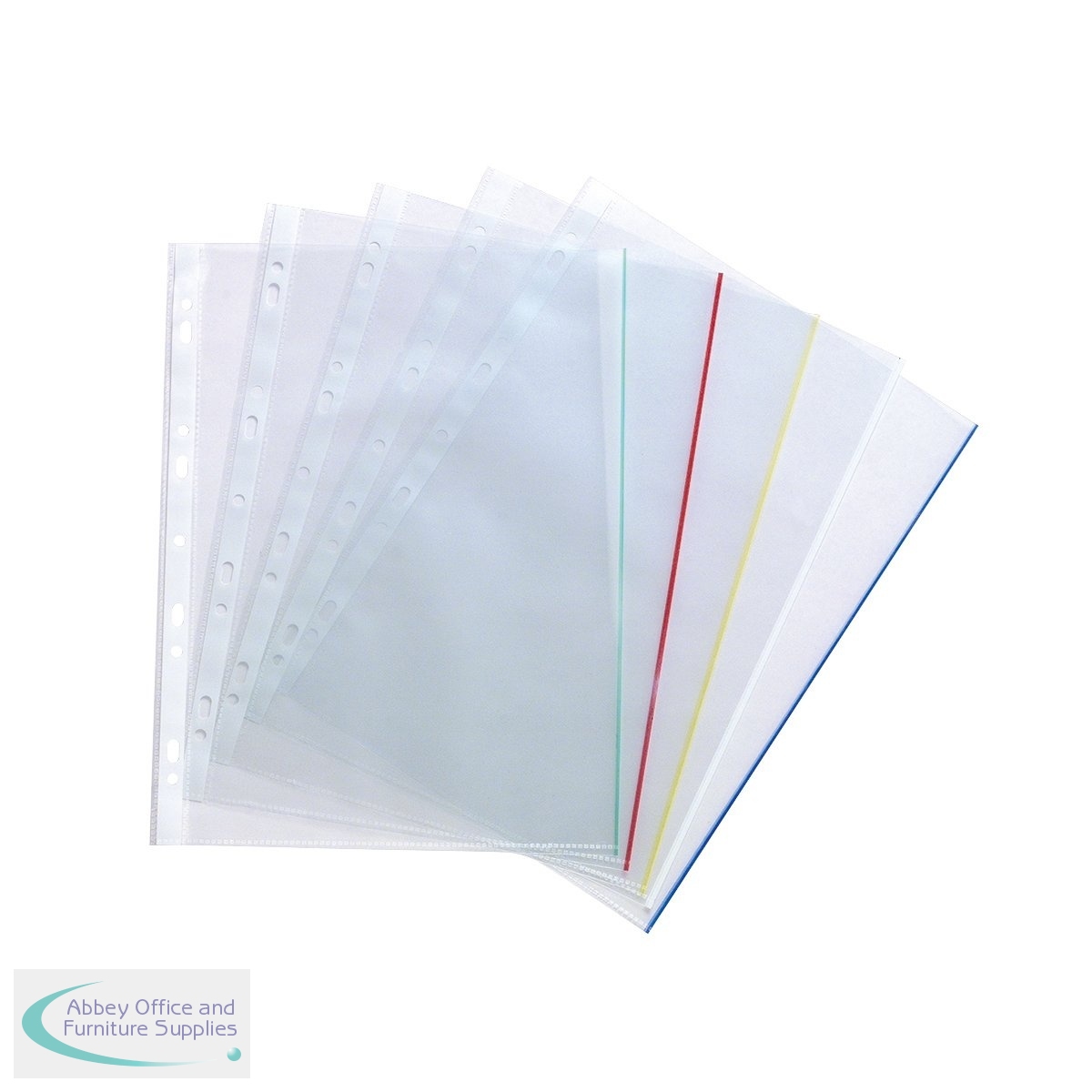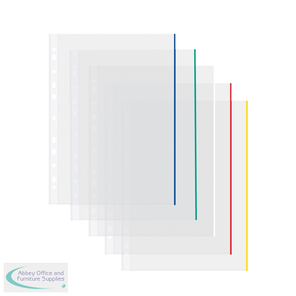 These A4 coloured edge punched pockets are great for implementing a colour coordinated filing system in the office, or at home. The 50 micron polypropylene is copysafe, anti-static and has an embossed finish to reduce glare. The pockets are top opening and feature a multi-punched strip for filing in standard ring binders and lever arch files. This pack contains 100 pockets with blue, green, red, yellow and white edges.