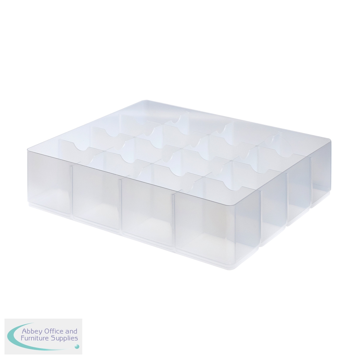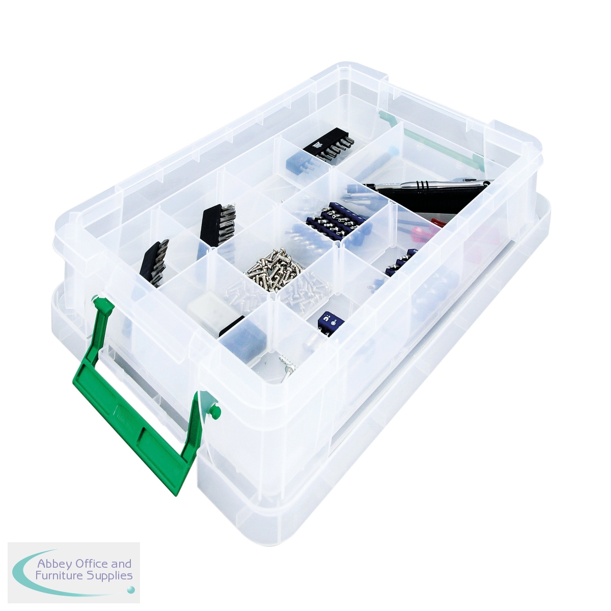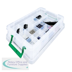 This handy large tray fits StoreStack 24 litre boxes (2 trays per box) and 36 litre boxes (3 trays per box), and features fixed plastic dividers, which create 16 compartments for customisable use. Ideal for organising stationery, tools, and other small items, this pack contains 1 large, clear tray. (Box not Included).