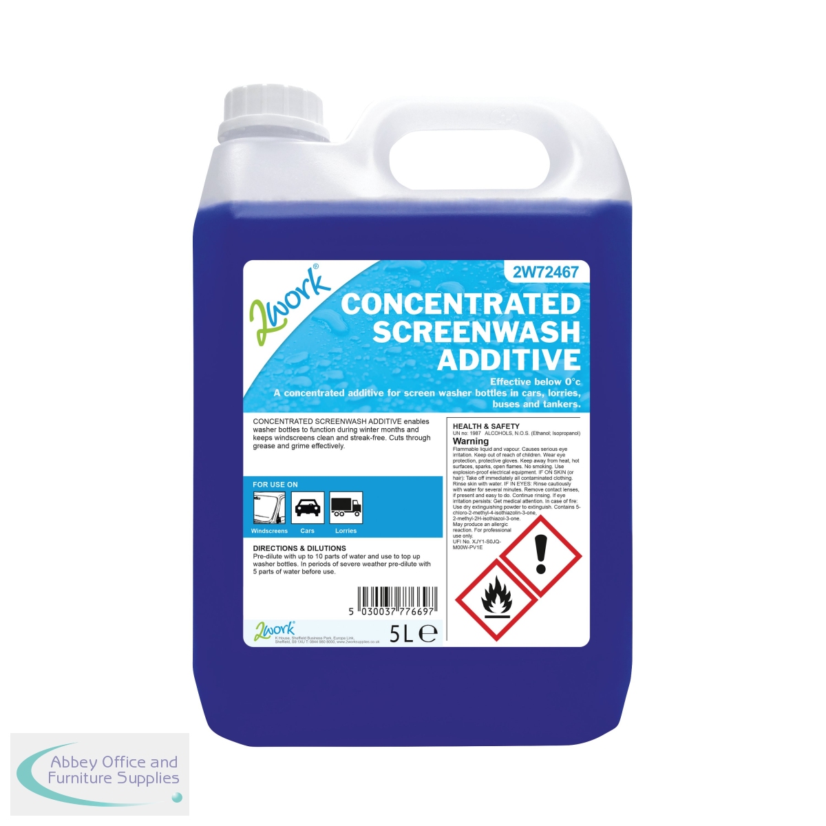 This 2Work Screen Wash Additive features a concentrated formula, which cuts through grease and grime on your windshield to leave a streak free finish. The blend of surfactants and Isopropanol remains effective even below 0 degrees Celsius. This pack contains one 5 litre bottle.