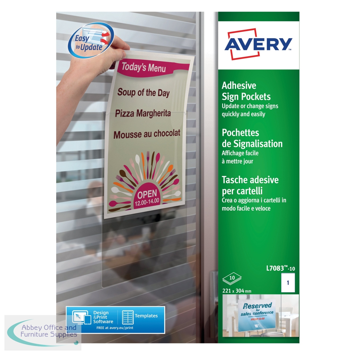 Ideal for temporary or frequently updated A4 signs, these Avery sign pockets feature a strong adhesive backing, which attaches to walls and windows, but removes cleanly. Made from durable polypropylene, these sign pockets are ideal for menus, rotas, notifications and more. This pack contains 10 clear A4 pockets.