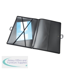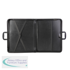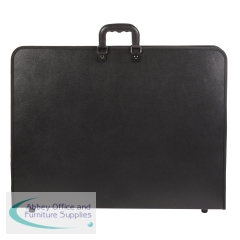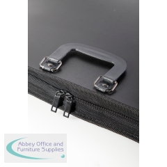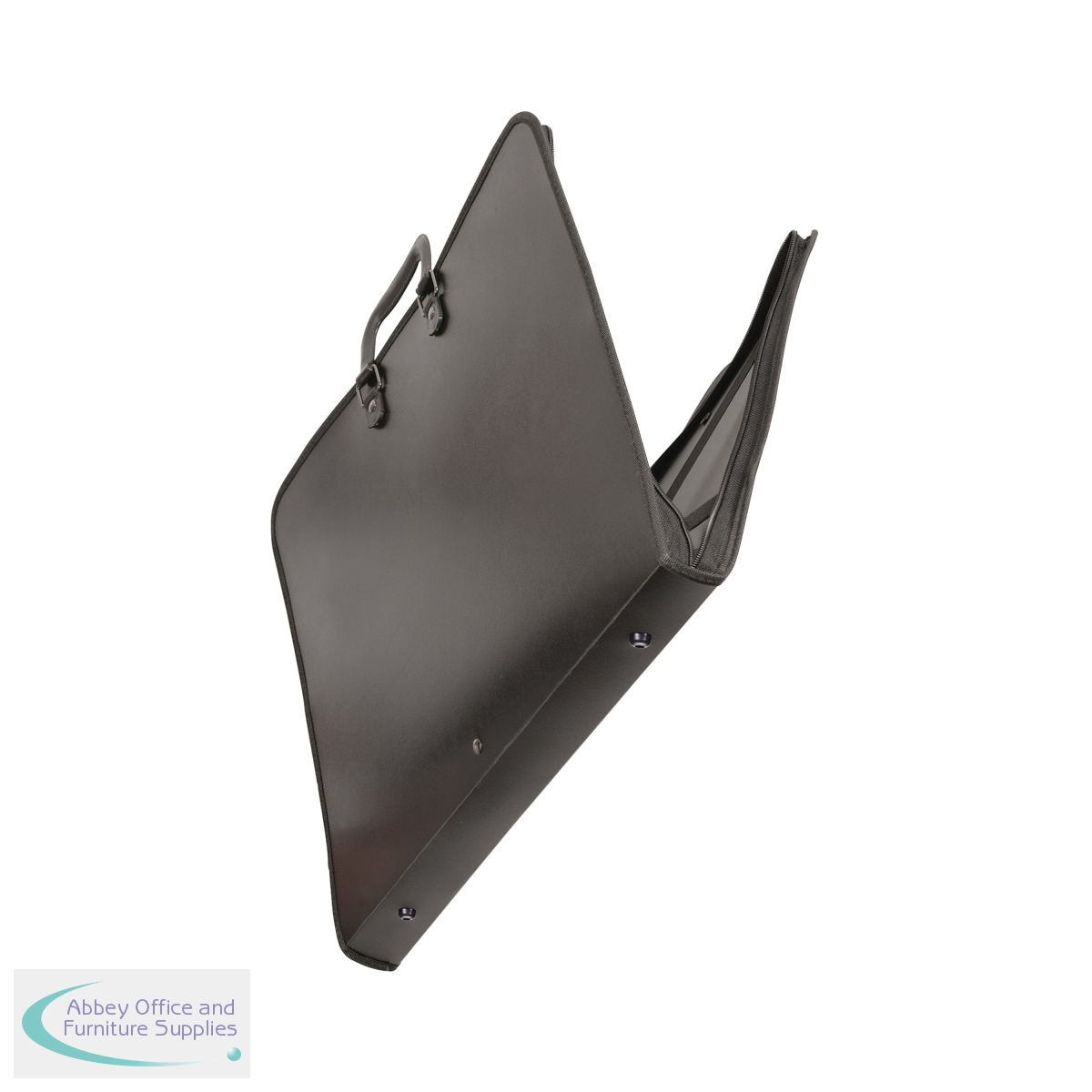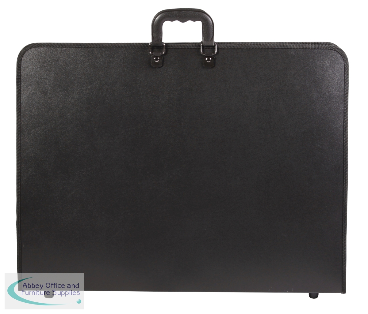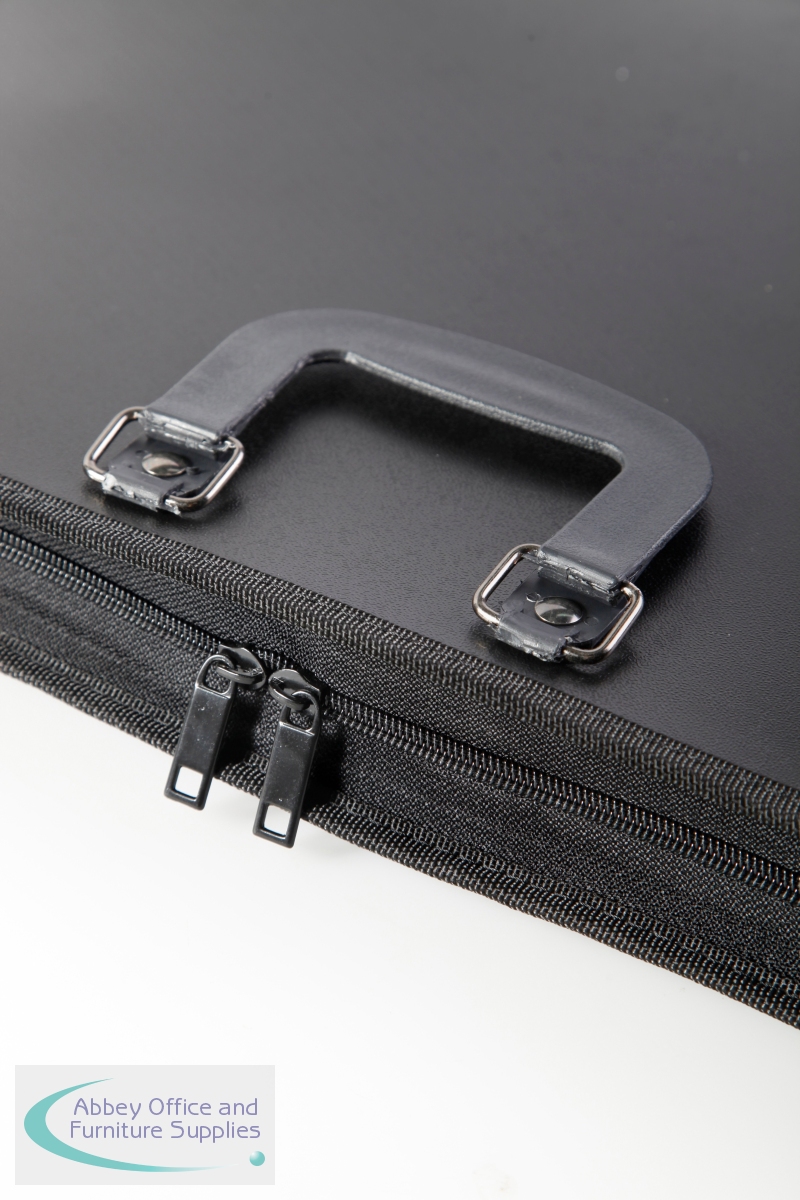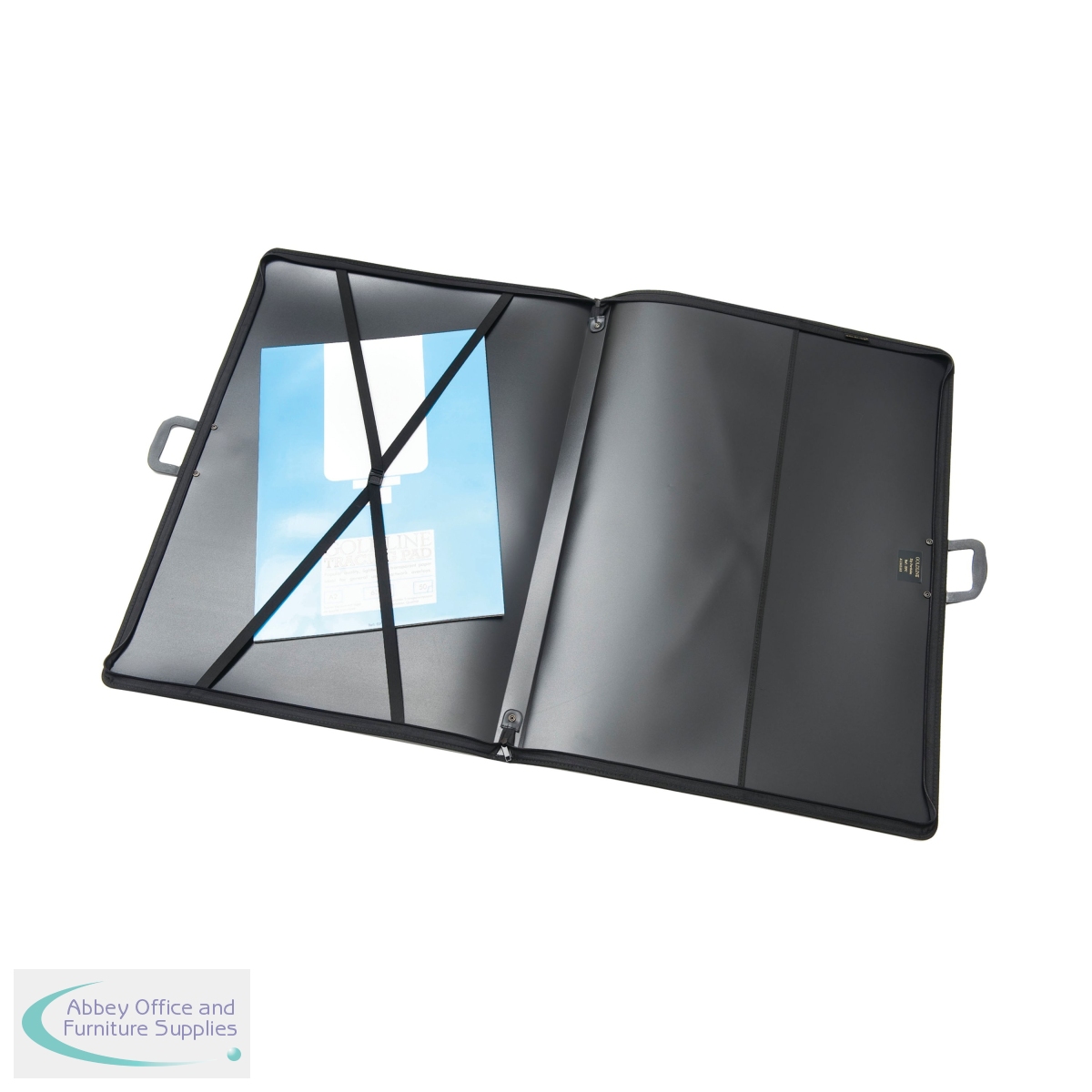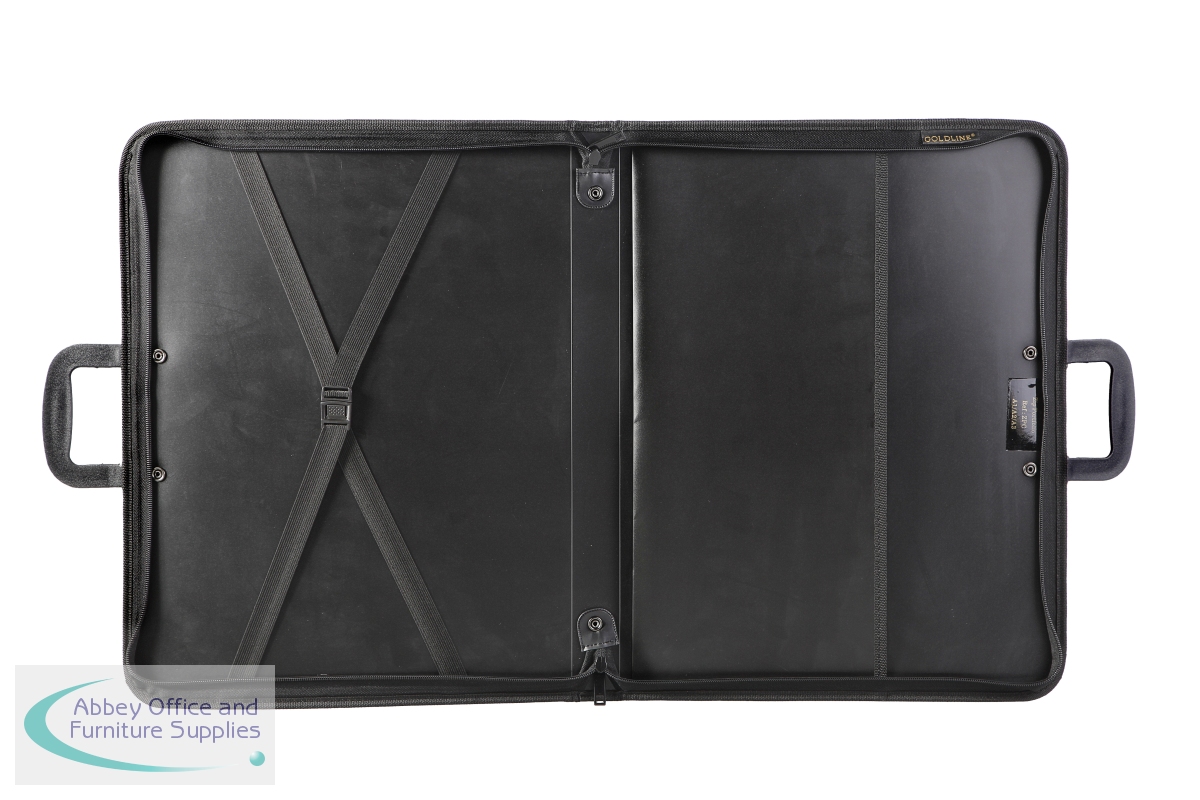 Made from durable, lightweight polypropylene, this Goldline portfolio is ideal for transporting artwork, plans, blueprints, drawings and more. The portfolio features a full width interior pocket with crossover elastic straps to keep A1 documents secure. This black portfolio also features a full length nylon zip closure, comfortable carry handles and handy feet on the base.
