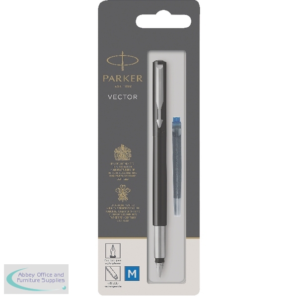 This sturdy and attractively-built Parker Vector Fountain Pen features a stainless steel nib to ensure the best possible line quality and fluid control. It's designed for easy, mess-free use by both students and professional users. The Vector fountain pen uses standard Parker Quink ink cartridges. One cartridge is supplied so you can get started writing straight away.