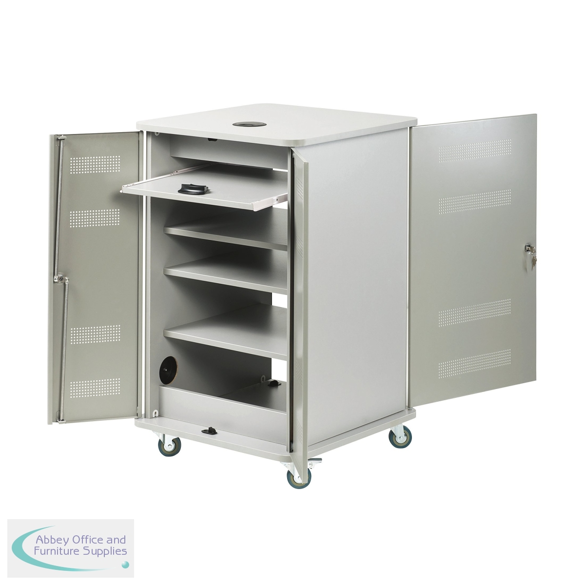 This Multimedia Projection Cabinet is extremely versatile, compact and secure housing a range of presentation equipment in its sturdy mobile cabinet. Its three shelves can be adjusted to suit different equipment sizes, while the projector shelf slides out for use and has a tilt angle adjuster. Easy to assemble, its steel front and rear doors lock for maximum security.