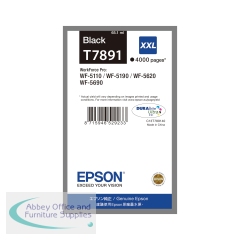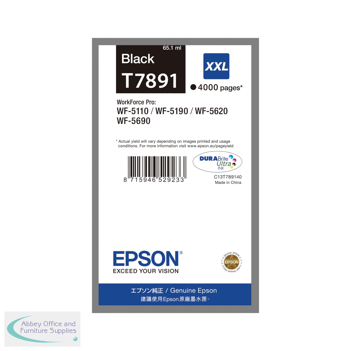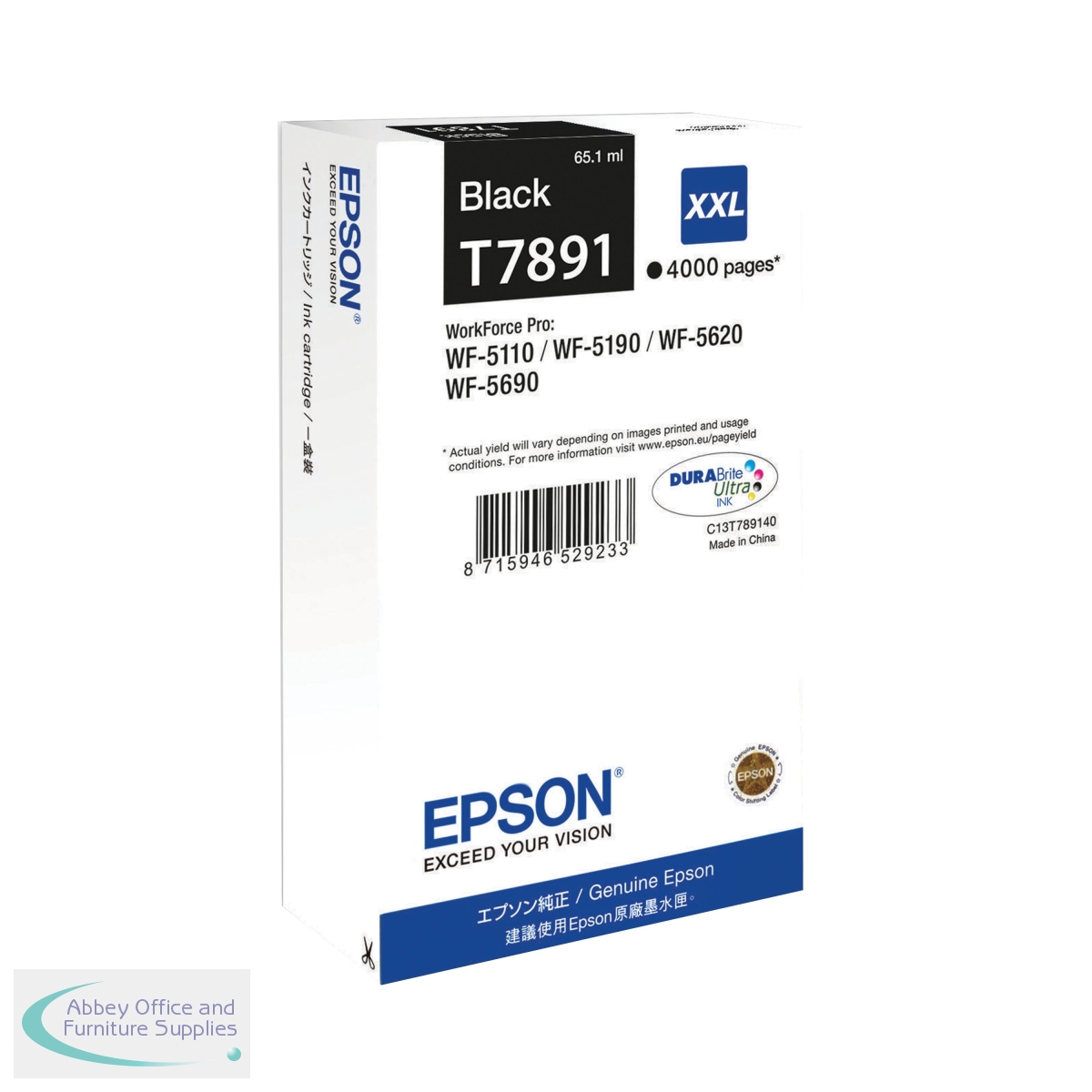 This genuine Epson T7891 inkjet cartridge is packed with 65.1ml of black ink for an exceptionally high print yield up to 4,000 pages. DURABrite Ultra ink ensures bright and crisp results, every time. Compatible with the WorkForce Pro WF-5110DW, WF-5190DW, WF-5620DWF and WF-5690DWF.