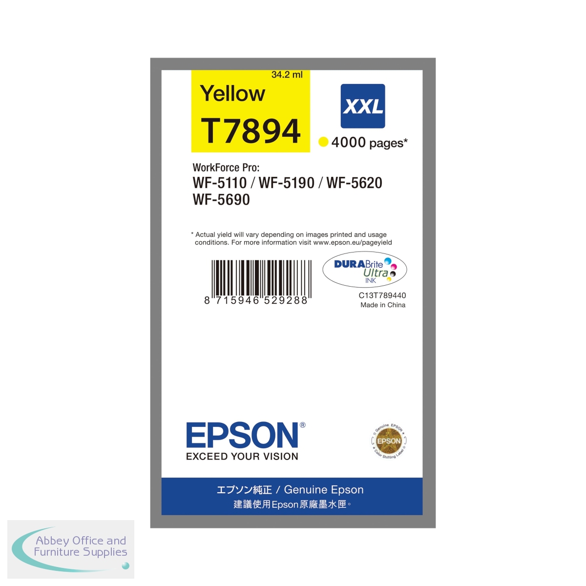 This genuine Epson T7894 inkjet cartridge is packed with 34.2ml of yellow ink for an exceptionally high print yield of up to 4,000 pages. DURABrite Ultra ink ensures bright and crisp results, every time. Compatible with the WorkForce Pro WF-5110DW, WF-5190DW, WF-5620DWF and WF-5690DWF.