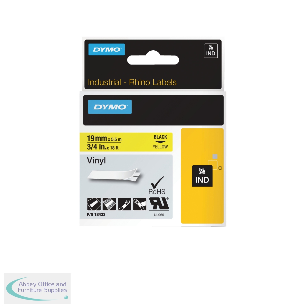 ES18433 - Dymo 18433 Rhino Vinyl Tape 19mm x 5.5m Black on Yellow S0718470