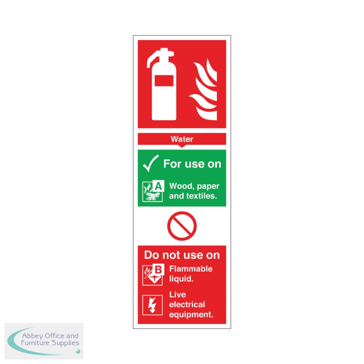 This sign details safe applications for water fire extinguishers. Simple to understand, using recognisable symbols and a universal colour scheme, this sign keeps employees, customers and visitors informed in the event of a fire. This rigid PVC sign measures 300 x 100mm.