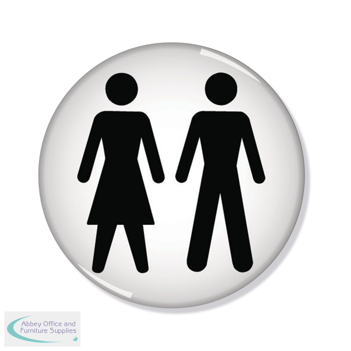 This domed sign acts as an indicator for washroom users. This 60mm diameter sign has a self-adhesive backing, allowing easy positioning on the door, without the need for tools. The black universal male and female symbols are instantly recognisable and the sign has a stylish white background.