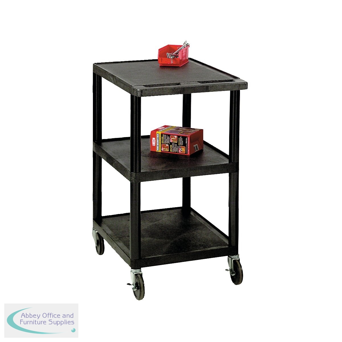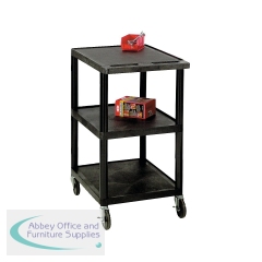 For an easy and convenient way of transporting goods, this black, aluminium service trolley from GPC is cost effective and reliable. The trolley features three individual layered shelves supported by strong aluminium uprights for stability. Mounted on four non-marking castors with two handles either side, it has a range of movement that allows it to be manoeuvred around the office with ease.