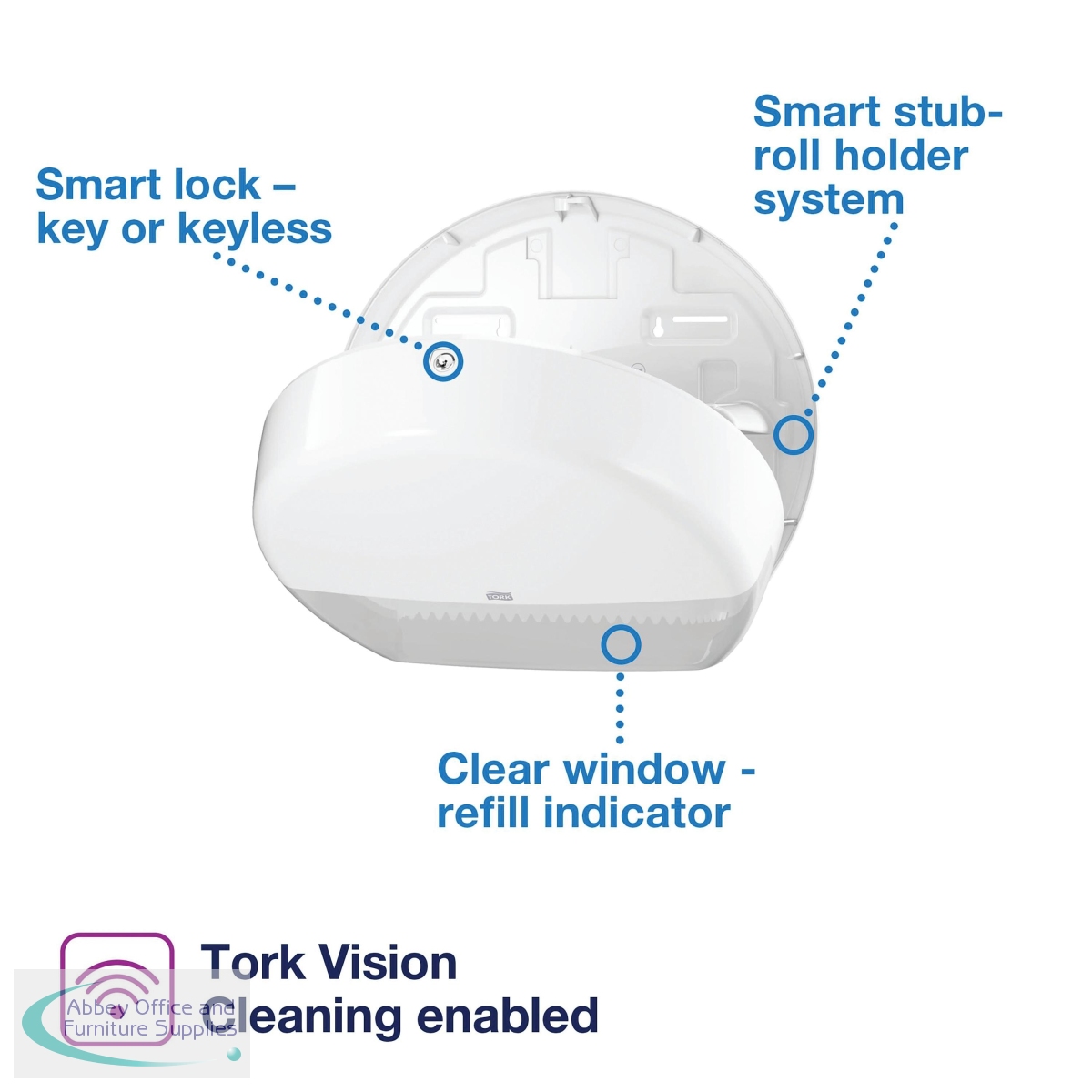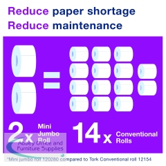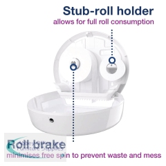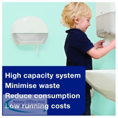 For use with Tork mini jumbo toilet rolls, this high capacity, T2 dispenser is great for medium to high traffic washrooms with space saving needs. The dispenser features an optional roll brake, which provides smooth dispensing, reduces waste and helps maintain hygiene levels. This hygienic, white plastic dispenser also features a semi-transparent window for easily identifying when a replacement roll is needed. Dimensions: W345 x D132 x H275mm.