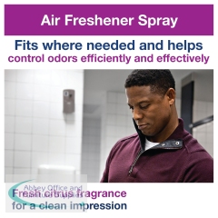 Tork Citrus Air Freshener Spray will effectively banish unpleasant smells in any washroom. A combination of concentrated air fragrance oils and odour neutralising agents provide a fresh scent 24 hours a day. Fit this efficient automatic air freshener spray inside the Tork Air Freshener Spray Dispenser and place it wherever required. The adjustable settings ensure this air freshener refill is suitable for a wide variety of washroom environments. This pack contains 12 refill bottles.