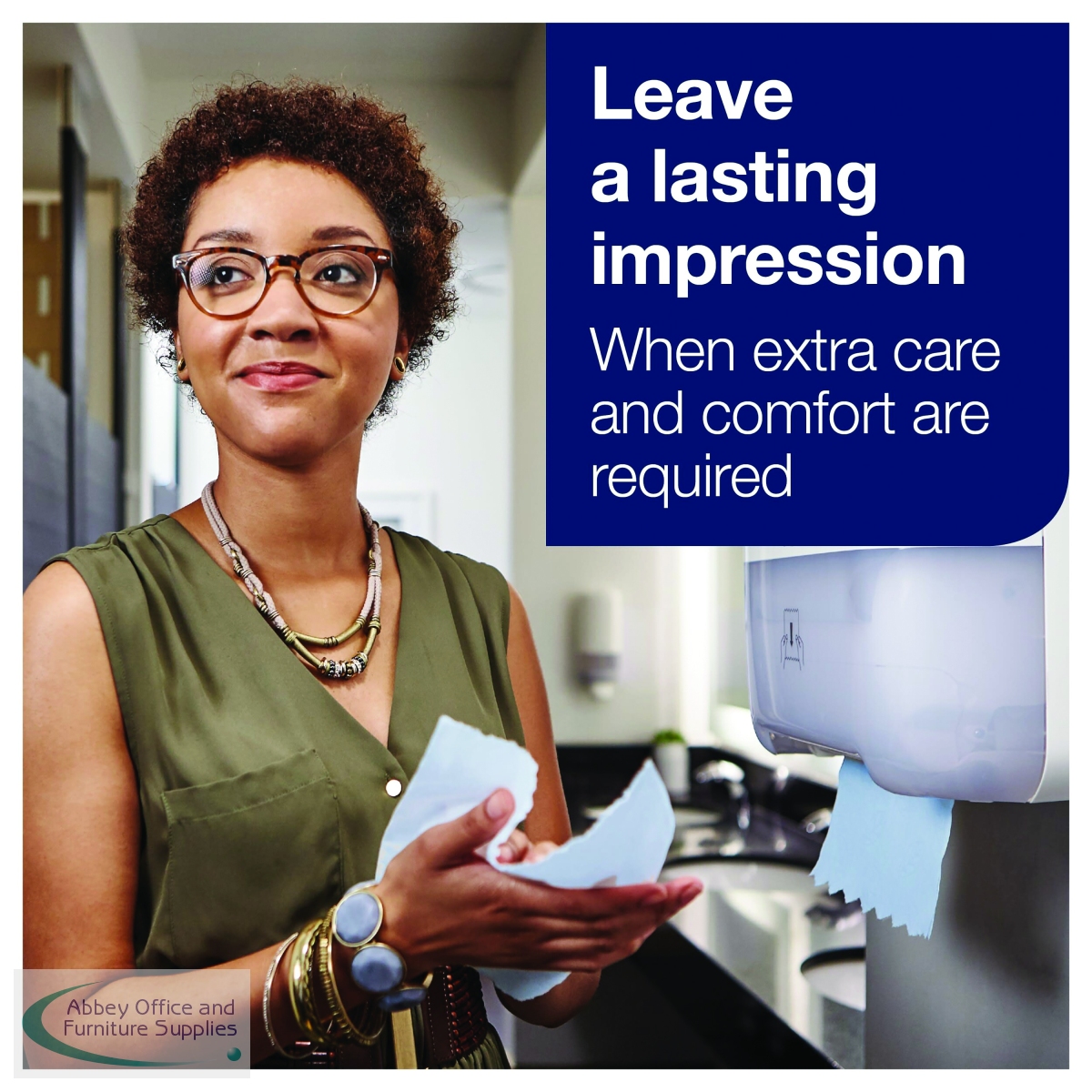 These premium soft hand towel rolls are suitable for use with Tork Matic dispensers to create a hygienic dispensing system suitable for all washrooms. The large, soft 2-ply sheets with embossed edges are dispensed one at a time to reduce consumption and waste. Due to the Food Safety Label and the traceability of the paper, the hand towels are ideal for gastronomic businesses and those working with food. This pack contains six blue 150 metre long rolls for long lasting use.