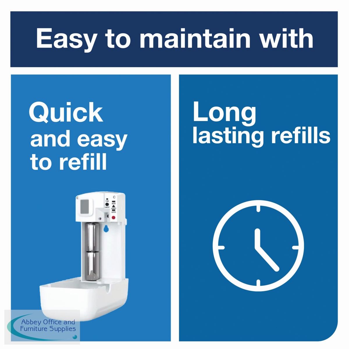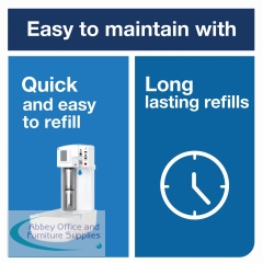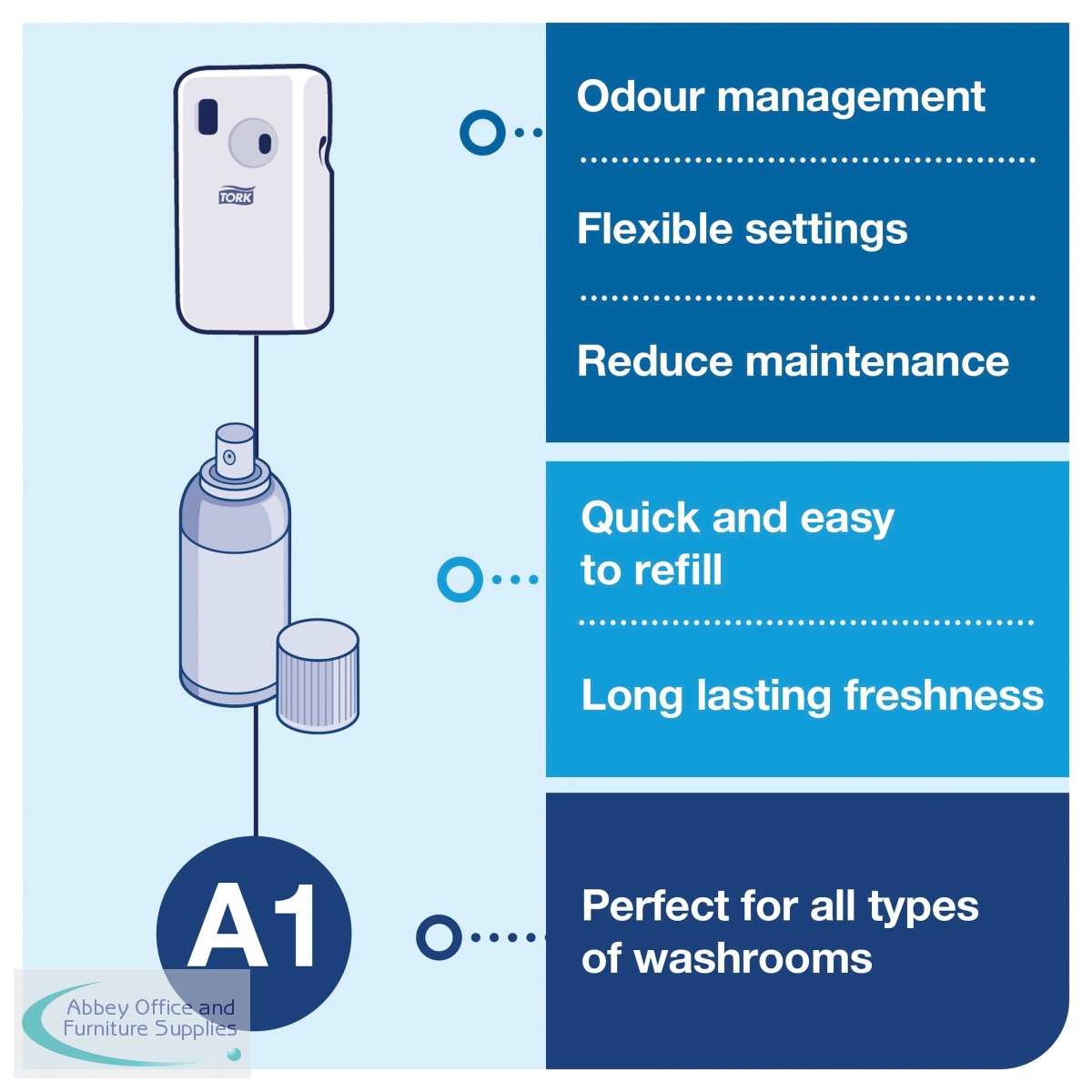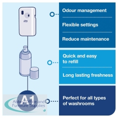 For use with Tork A1 refills (available separately), this air freshener spray dispenser provides long lasting freshness to shared washrooms. The easy programming provides a fresh scent 24 hours a day, while a refill indicator displays when refills are required to prevent running out. Supplied in white, the low maintenance, wall mounted dispenser is easy to refill with a long battery life and measures W97 x D60 x H174mm.