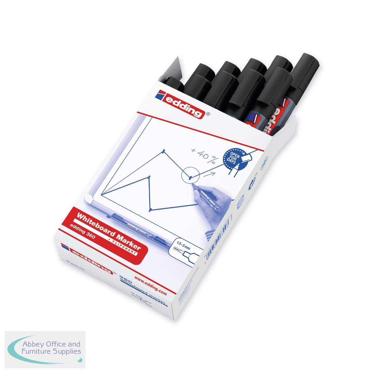 These Edding 360 Drywipe Markers can be used on most non-porous surfaces including enamel, glass and melamine. The low odour ink is quick drying, light resistant and wipes clean easily. The marker can also be left uncapped for up to 3 days without drying out. The bold bullet tip writes a 1.5 - 3.0mm line width. This pack contains 10 markers with black ink.