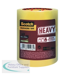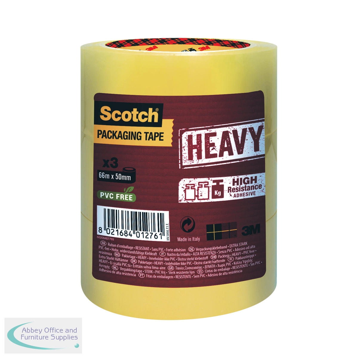 This Scotch heavy duty packaging tape is ideal for sealing boxes, parcels, envelopes and more. Made from durable polypropylene, the tape is PVC free and features a high resistance adhesive for long lasting use. This clear tape measures 50mm x 66m. This pack contains 3 rolls of tape.