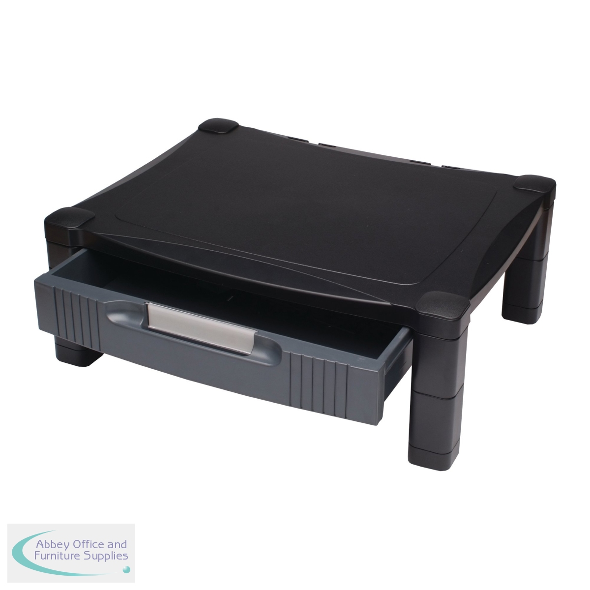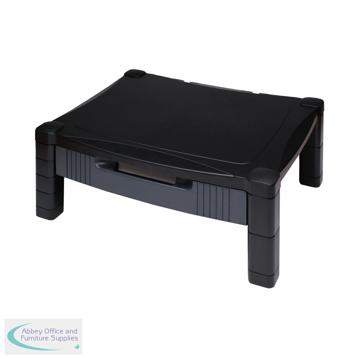 This Contour Ergonomics monitor stand has an adjustable height system of 100 to 160mm, helping to create an ergonomic viewing angle and greatly reducing stress on your back and neck. For use with laptops, 15 - 20in LCD or CRT monitors, and printers or other office machines, the stand also has a built-in cable organiser, padded feet, and an integrated drawer to maximise desktop space and minimise clutter. This black monitor stand measures W433 x D346 x H164mm, with a platform size of 430 x 340mm.