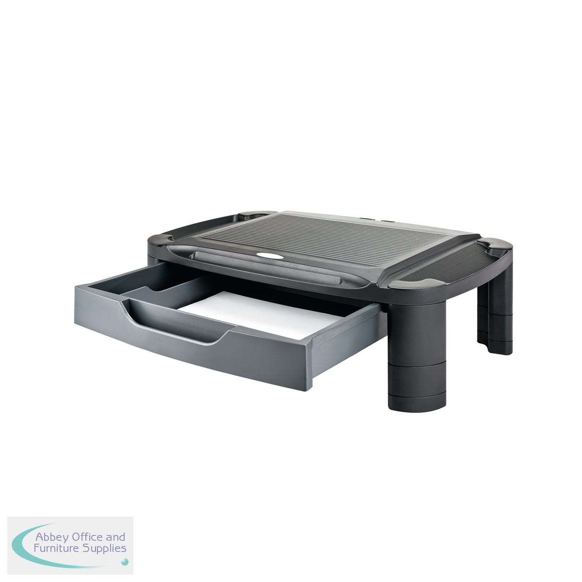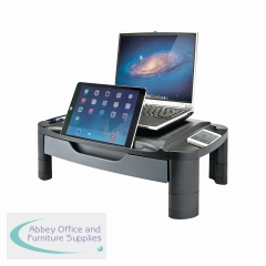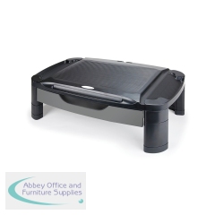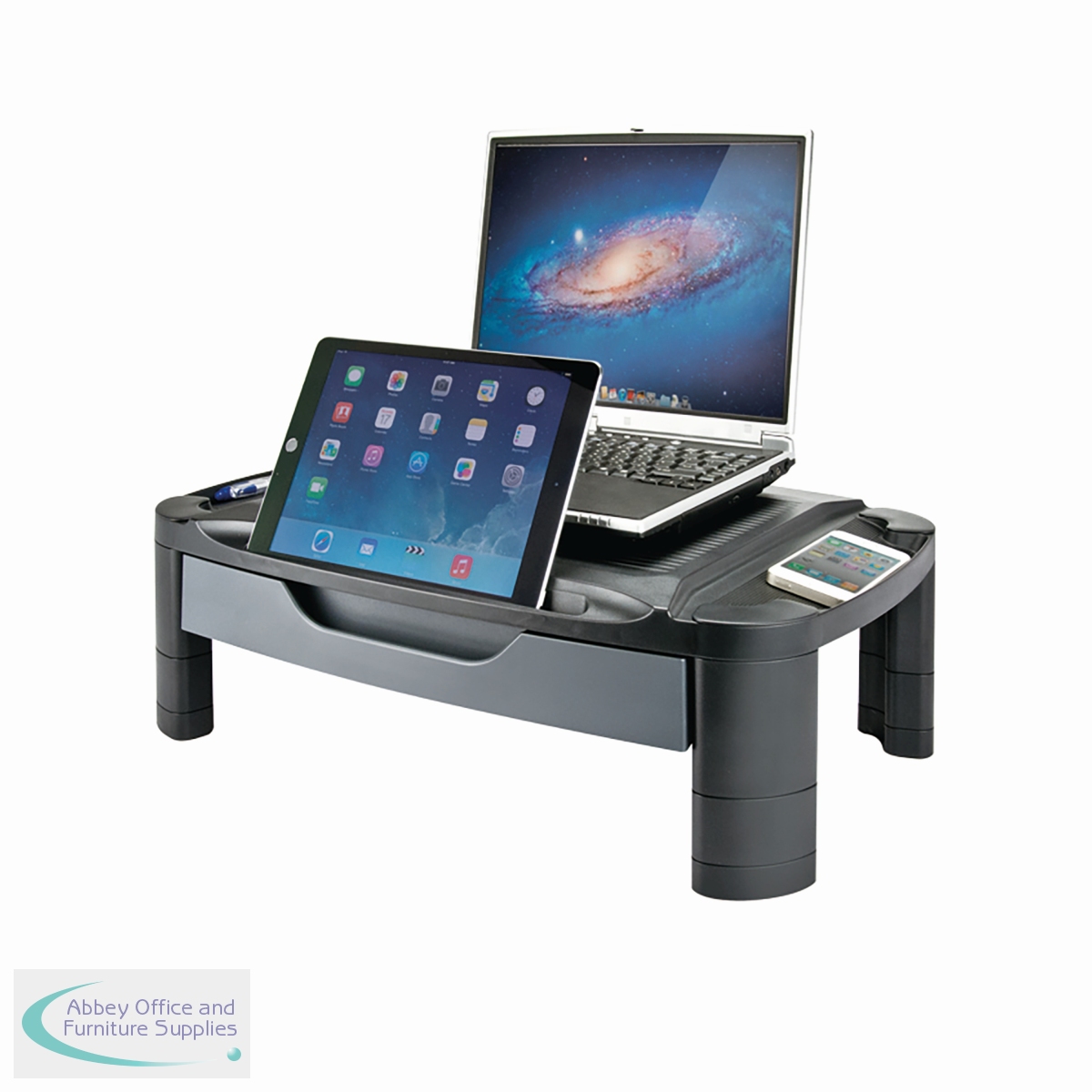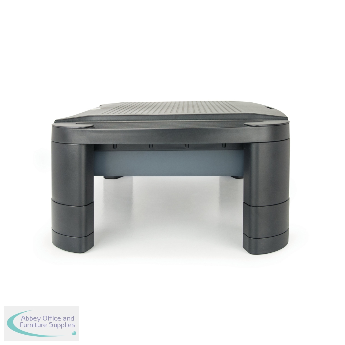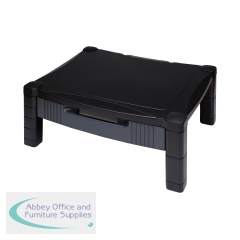 This Contour Ergonomics Professional Monitor Stand provides an elevated platform for laptops, notebooks and monitors up to 24 inches in size. The stand raises your monitor to eye level to create an ergonomic viewing angle to reduce stress on the back and neck, even over extended periods of working. The stand is height adjustable from 95mm to 175mm using the 3 unique stacking columns. The stand also features an integrated drawer to store stationery, accessories or even your smartphone or tablet, as well as accessory trays on both sides for extra storage. With a maximum weight capacity of 15kg, the stand can also be used to hold printers or other office machines. This black stand measures W550 x D350 x H175mm.