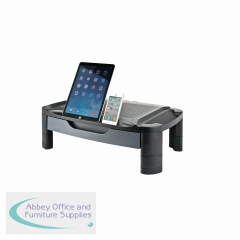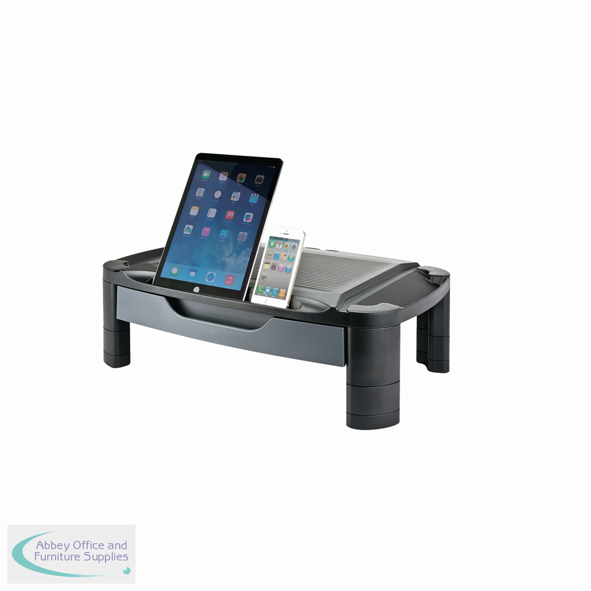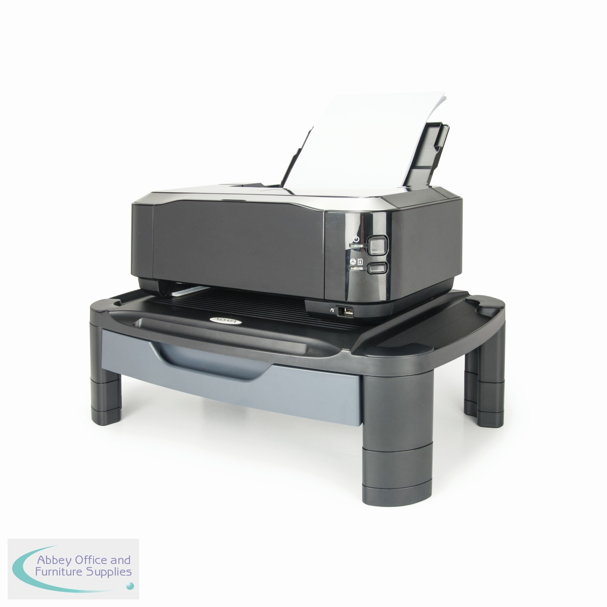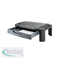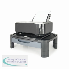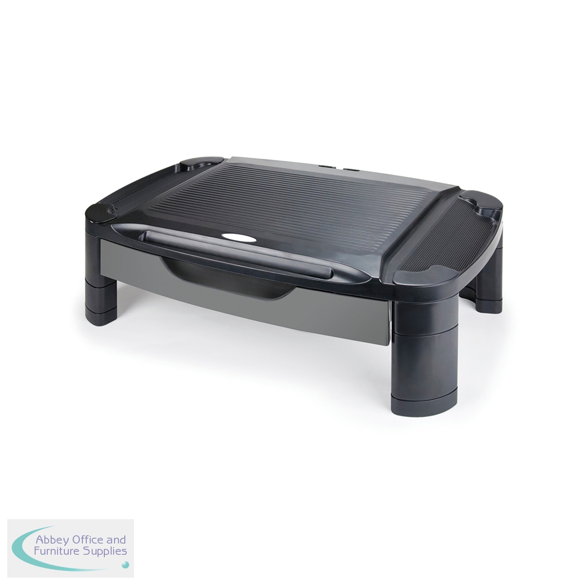 This Contour Ergonomics Professional Monitor Stand provides an elevated platform for laptops, notebooks and monitors up to 24 inches in size. The stand raises your monitor to eye level to create an ergonomic viewing angle to reduce stress on the back and neck, even over extended periods of working. The stand is height adjustable from 95mm to 175mm using the 3 unique stacking columns. The stand also features an integrated drawer to store stationery, accessories or even your smartphone or tablet, as well as accessory trays on both sides for extra storage. With a maximum weight capacity of 15kg, the stand can also be used to hold printers or other office machines. This black stand measures W550 x D350 x H175mm.