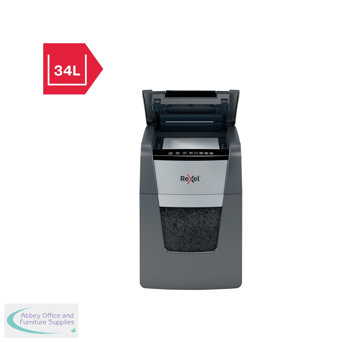 Rexel Optimum AutoFeed+ 100X cross-cut shredder automatically shreds up to 100x A4 sheets of paper (80gsm) at a time, into P-4 (4x28mm) cross-cut pieces. This auto feed shredder machine is a sophisticated office shredder, featuring a 34L pull out bin. The auto-feed removes the need to manually feed paper, and with the capability to accept staples and paper clips, the tedious process of manual removal is also unnecessary.
