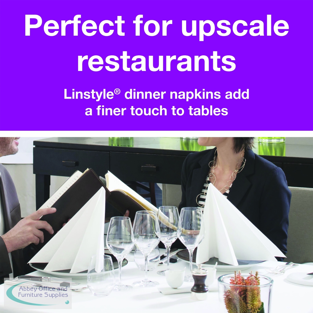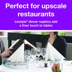 These quality, Tork LinStyle dinner napkins are ideal for restaurants and hospitality featuring the look and feel of luxury linen but are single use, so laundry services are not required. The durable non-woven fabric provides high strength and absorbency, as well as a high tear resistance. Each white, 1-ply napkin measures 390 x 390mm (unfolded). This pack contains 50 napkins.