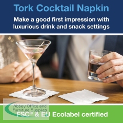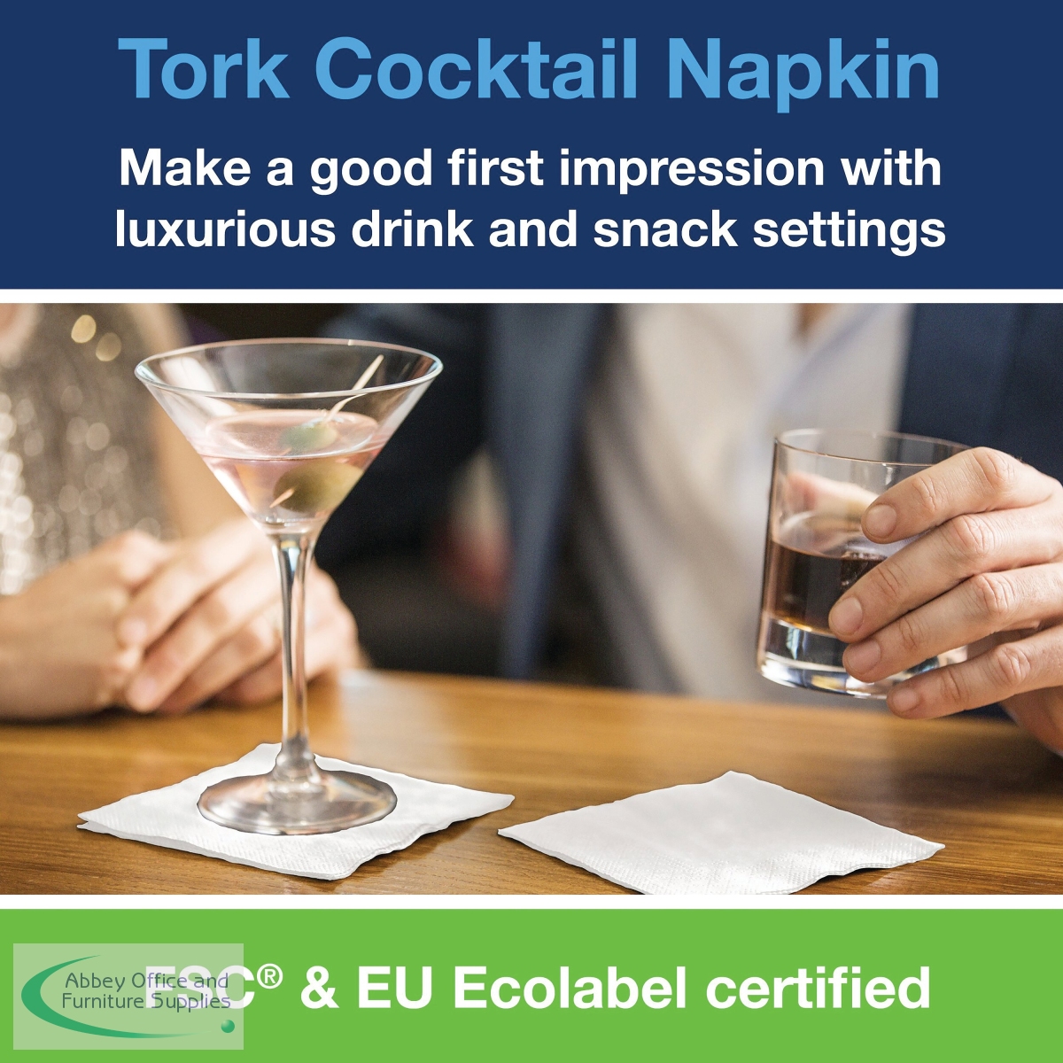 Designed for use in bars and cafes where snacks and drinks are served, these high quality, Tork cocktail napkins are simple and elegant. Featuring a soft yet durable 2-ply construction, each white napkin measures 240 x 238mm (unfolded). This bulk pack contains 200 napkins for everyday use, keeping tables looking stylish and hygienic.