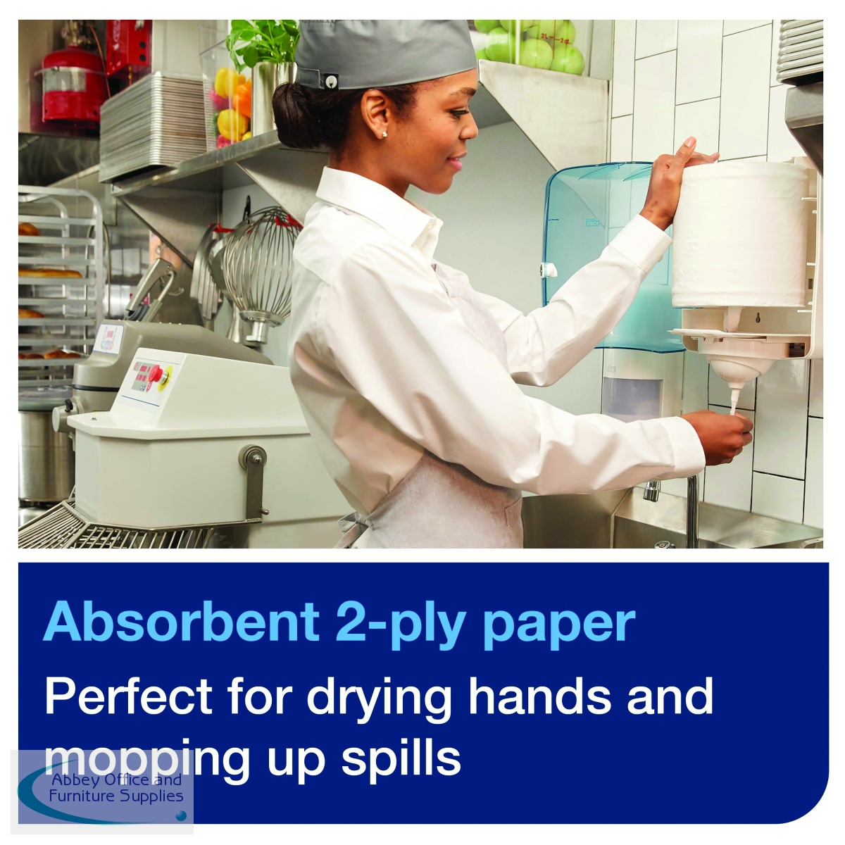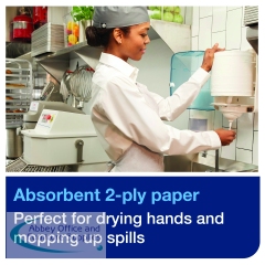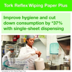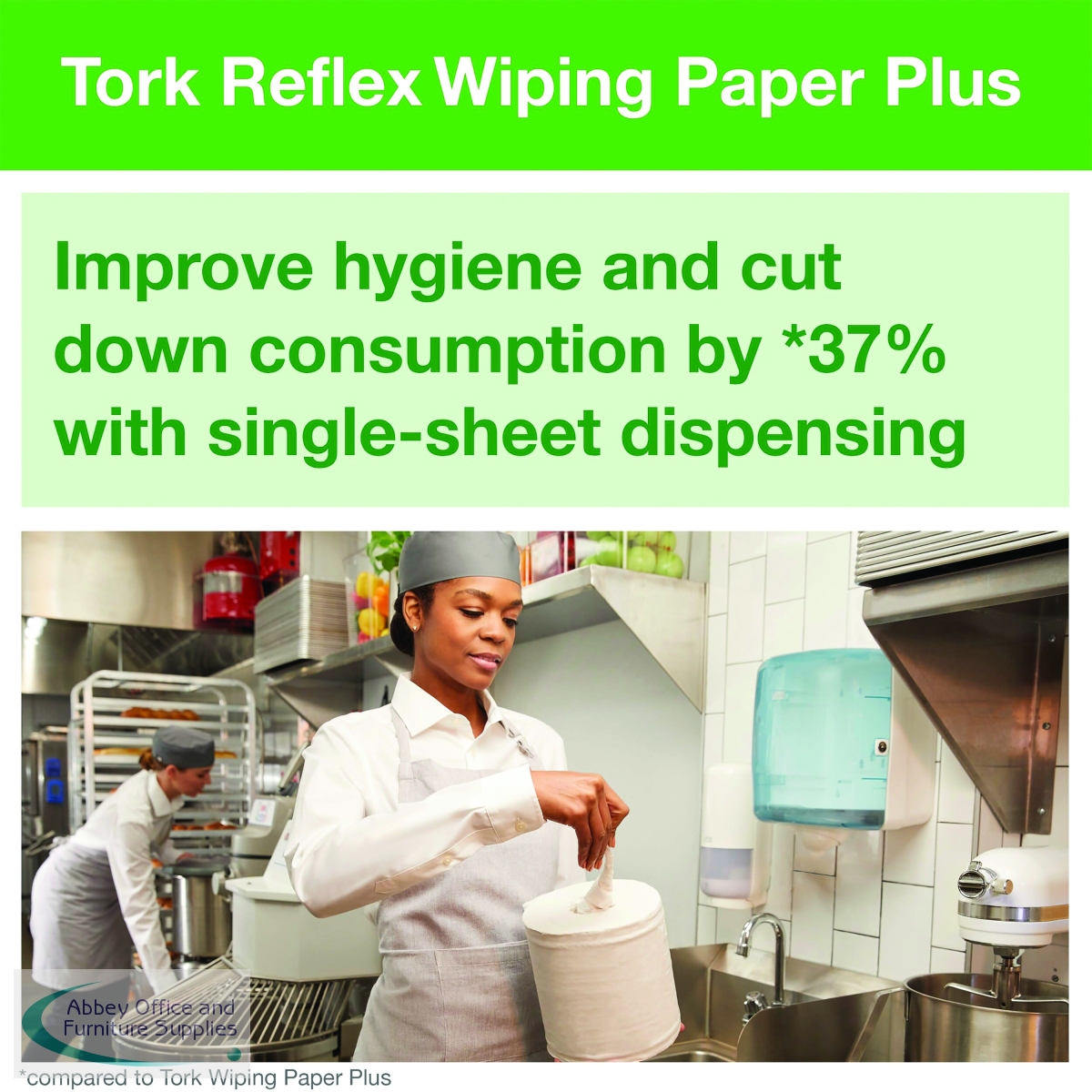 This two-ply Tork Reflex wiping paper plus is designed to take on any task that requires strength and absorbency whether it is quickly drying hands or mopping up liquids. For use with Tork's single sheet centrefeed dispenser systems to reduce consumption by 37%, saving money on industrial paper rolls. The absorbent, two-ply white paper comes on 150.2m rolls, with 429 sheets per roll. This pack contains 6 rolls.