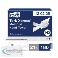 Designed for use in the Tork H2 dispenser, these Tork Xpress Soft multi-fold Paper Hand Towels are soft and absorbent for fast and efficient hand drying. The interfold towels are designed to dispense one at a time to reduce consumption and feature an attractive leaf design. Each tear-resistant, 2-ply towel measures 240 x 213mm (unfolded). This pack contains 21 sleeves with 180 hand towels per sleeve.