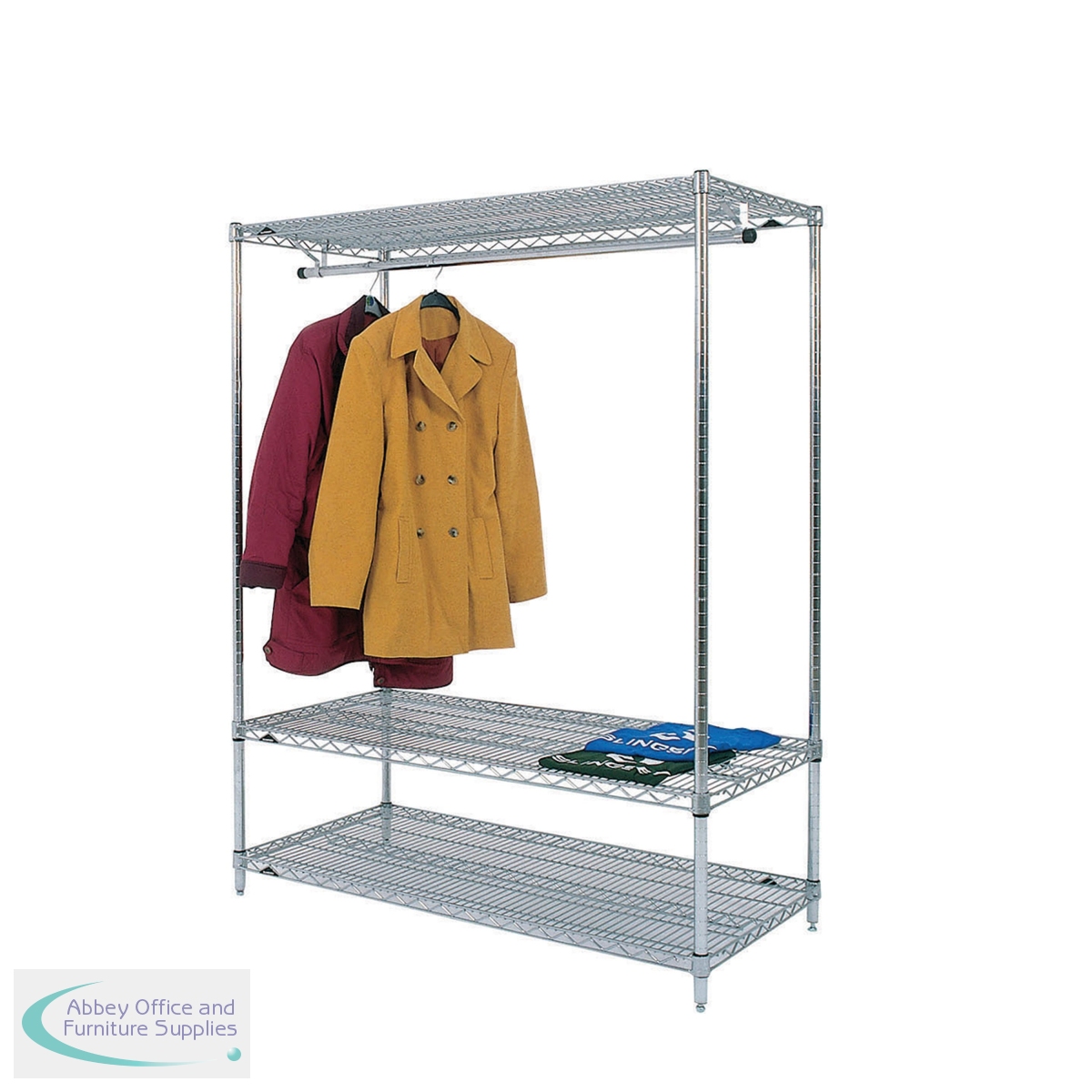 Ideal for use in an office, retail outlet, cloakroom, changing room or even in the home, this garment rail displays hanging clothes and comes supplied with 1 rail as well as 3 wire shelves for further storage. The rail is easily assembled, with the chrome rail attaching easily and quickly to the underside of the wire top shelf. Its static nature makes it robust and stable throughout regular and sometimes rough usage.
