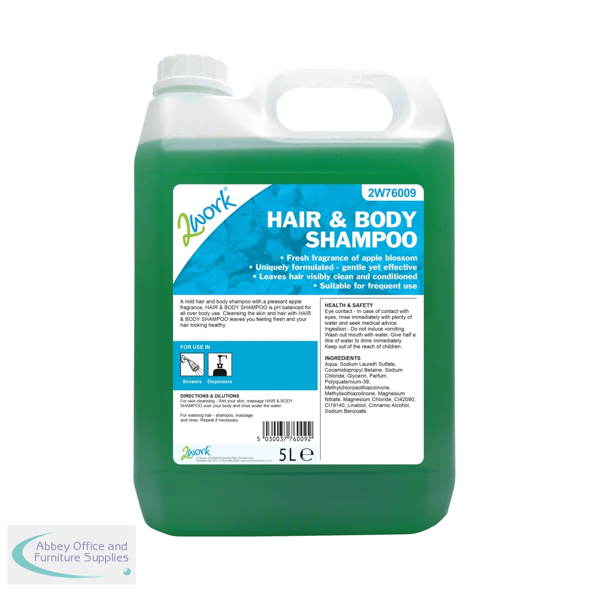 This high foaming 2Work hair and body wash is suitable for use as shampoo, bubble bath, shower gel and as an all over body wash. The pH balanced formula is kind on skin and contains essential conditioning agents to cleanse, freshen and moisturise in one application. The hair and body wash leaves a lasting apple fragrance. Ideal for hotel rooms, gyms, changing rooms, health clubs, sports centres and shower areas, this pack contains 1 bulk 5 litre bottle.