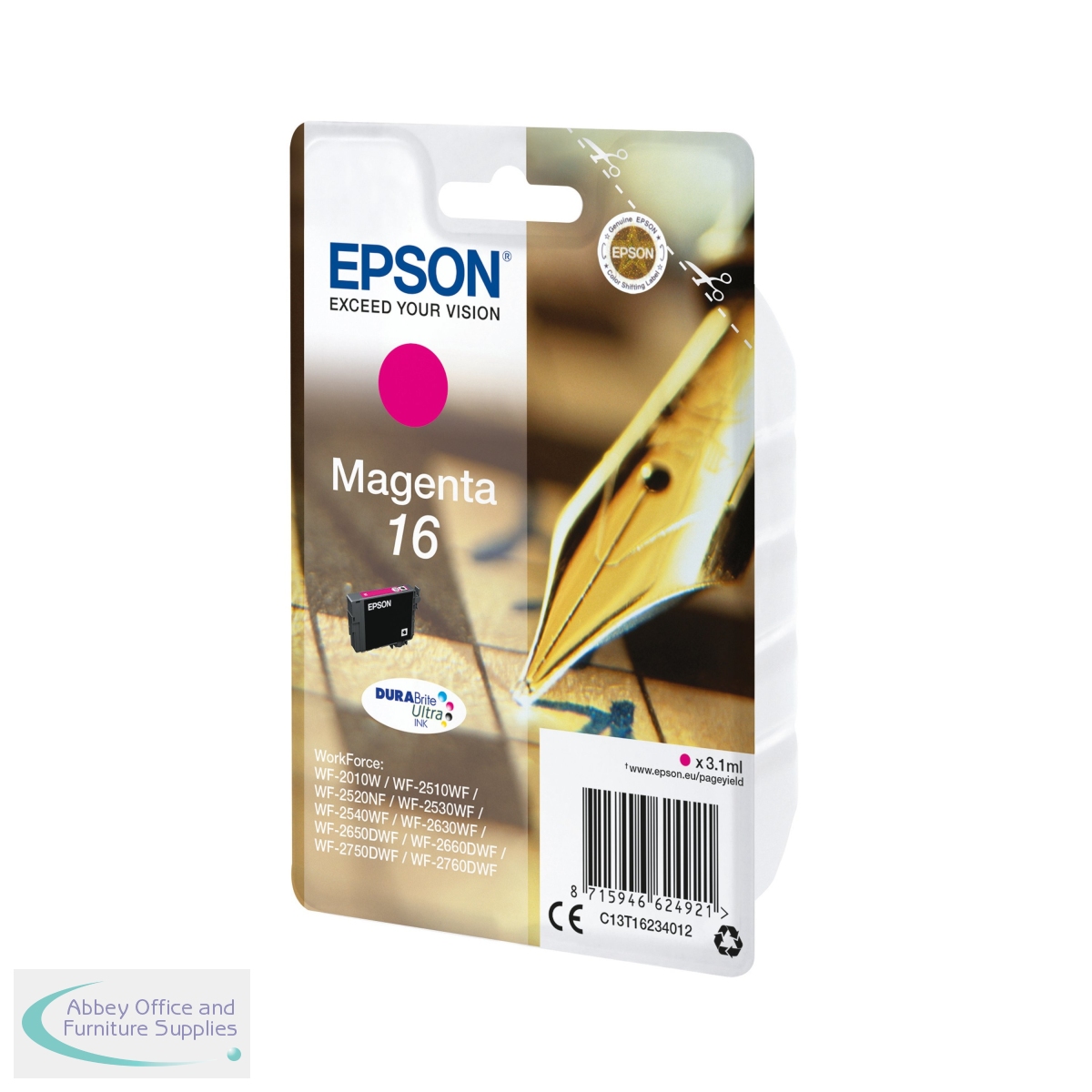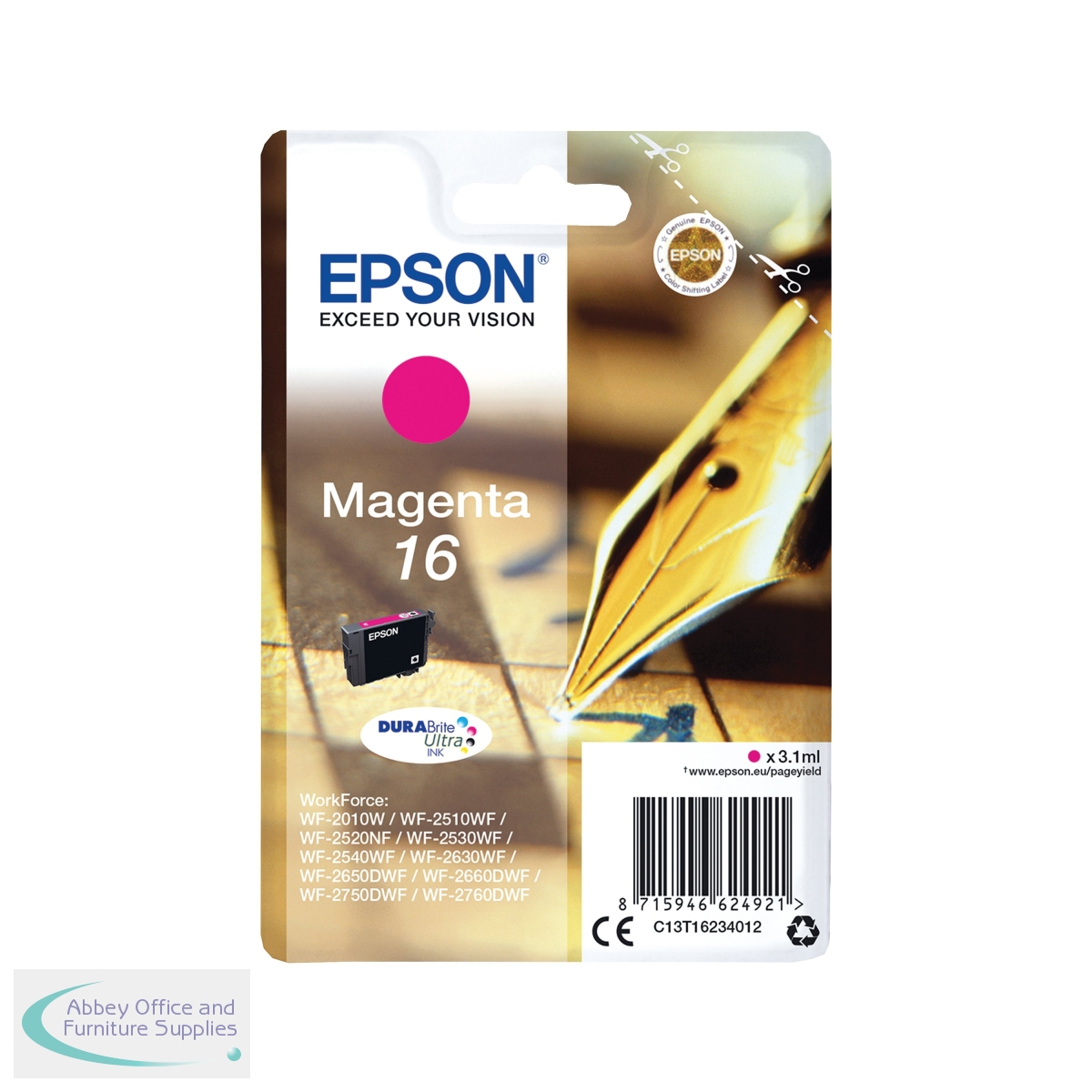 This Epson 16 Magenta Inkjet Cartridge ensures high quality print output from your Epson WorkForce inkjet printer. As a genuine Epson consumable, it ensures consistent and reliable operation for trouble-free printing when you need it most, and is packed with 3.1ml of magenta ink. Epson ensures that every cartridge meets its high standards and works with your machine to provide precise, clear printing.