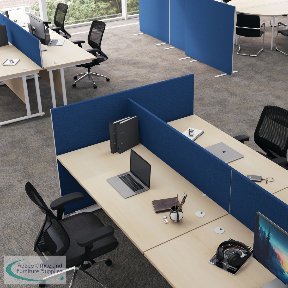 Create a personalised desk space with the First range of desk screens. Ideal for adding privacy to your workstation, or accessorising using a tool rail and a range of fitments. Completed with a high-quality royal Blue finish, this desk mounted screen comes supplied with desk clamps for suitable installation. Dimensions (WxH): 1800x400mm.