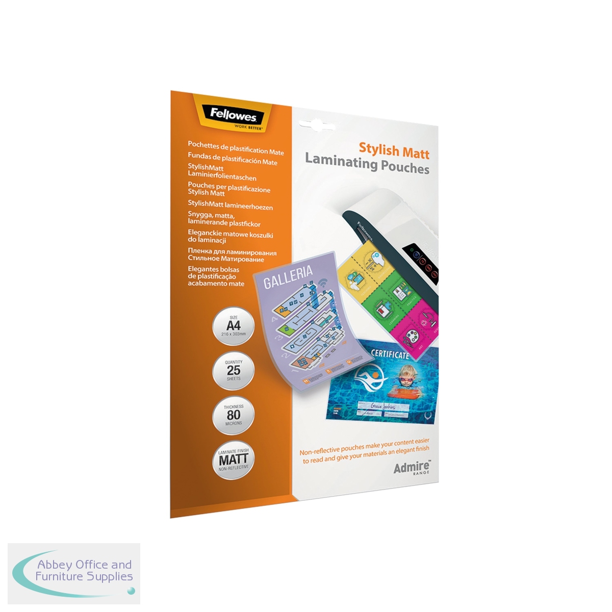 BB73087 - Fellowes Admire Laminating Pouch A4 160 Micron Total Thickness Matte (Pack of 25) 5602101
