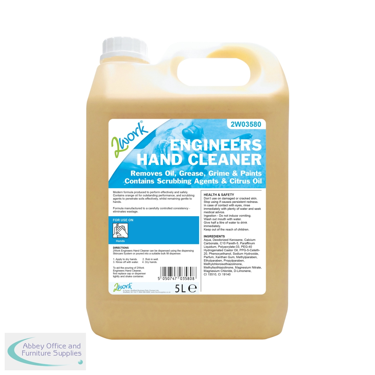 This 5 litre bottle of 2Work Engineers Hand Cleaner orange scented cleaning formula performs effectively and safely with added scrubbing agents for added cleaning power to penetrate soils. Suitable to remove oil, grease, ink, bitumen, asphalt, tar, paint, plaster, creosote, mud and ground in soils from the skin. Free from Polybeads. Pack contains one 5 litre bottle.