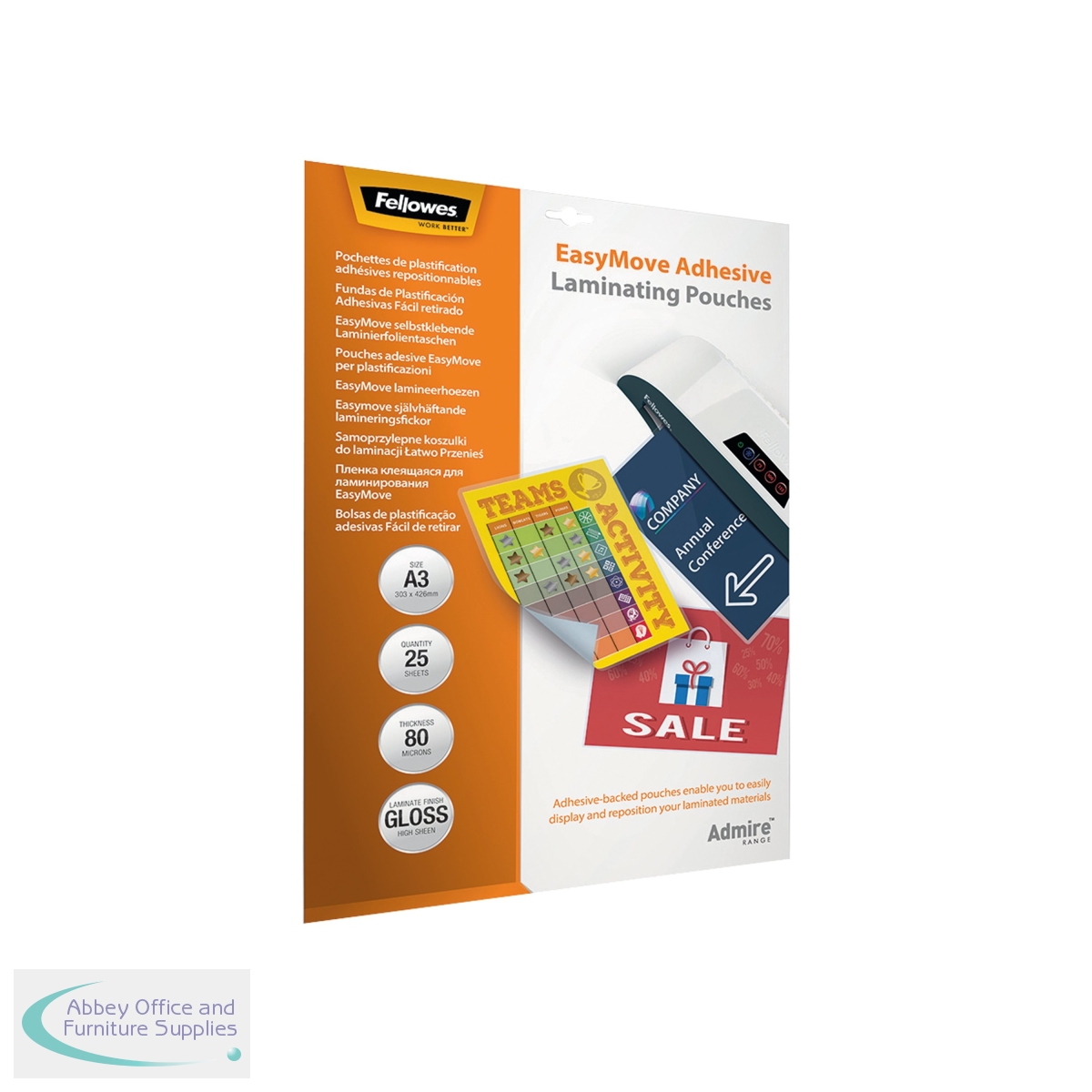 The Fellowes EasyMove A3 pouch is an adhesive backed pouch enabling you to easily display and reposition your laminated material. Each 160 micron thick, high sheen, gloss finished pouch provides sturdy protection to your notices, posters or charts. Easy to wipe clean and help protect your material from damage resulting from regular handling or from the elements.