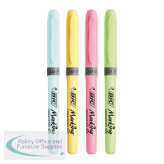 This Bic highlighter contains fluorescent, water based ink and features a textured rubber grip for comfort. Suitable for paper, faxes and photocopies, the pen has a cap off time of up to 8 hours. The chisel tip provides a variable line width of 1.6 - 3.3mm for both underlining and highlighting. This pack contains 4 pens with assorted pastel coloured ink (blue, yellow, pink and green).