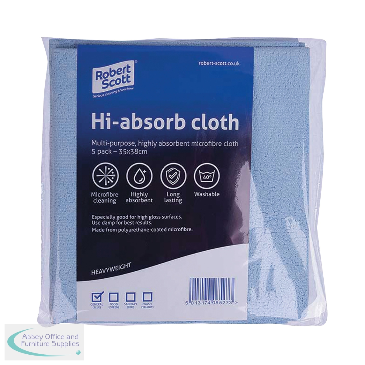 These Robert Scott Hi-Absorb Microfibre Cloths are ideal for use on high gloss surfaces. Made from polyurethane coated microfibre, the highly absorbent cloths are machine washable for long lasting use. Use damp for great cleaning results on a variety of surfaces. Each cloth measures 350 x 380mm. This pack contains 5 blue cloths.