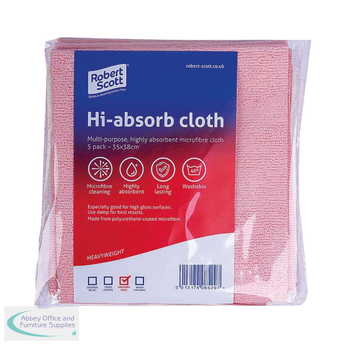 These Robert Scott Hi-Absorb Microfibre Cloths are ideal for use on high gloss surfaces. Made from polyurethane coated microfibre, the highly absorbent cloths are machine washable for long lasting use. Use damp for great cleaning results on a variety of surfaces. Each cloth measures 350 x 380mm. This pack contains 5 red cloths.