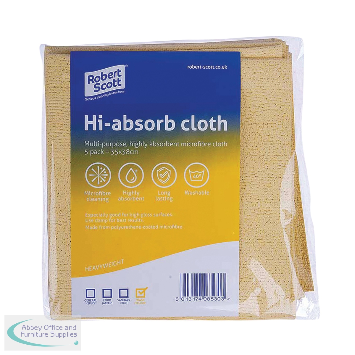 These Robert Scott Hi-Absorb Microfibre Cloths are ideal for use on high gloss surfaces. Made from polyurethane coated microfibre, the highly absorbent cloths are machine washable for long lasting use. Use damp for great cleaning results on a variety of surfaces. Each cloth measures 350 x 380mm. This pack contains 5 yellow cloths.
