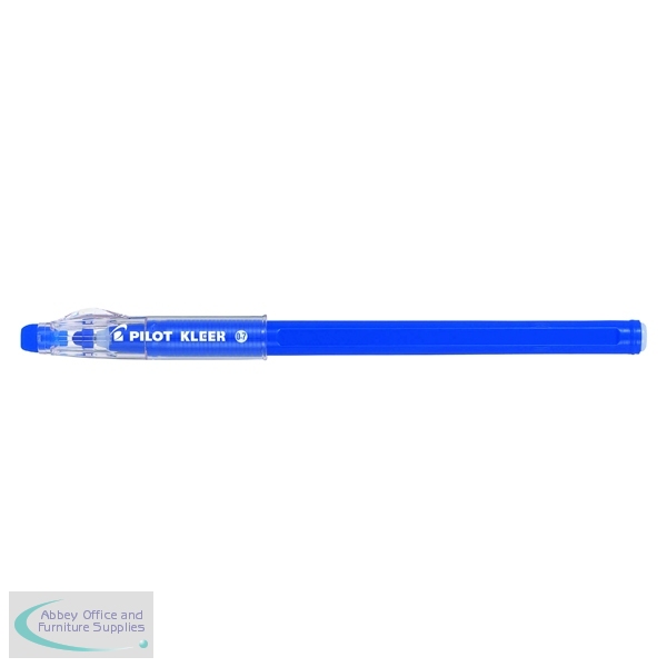 This Pilot Kleer ballpoint pen contains thermo-sensitive, erasable ink, which can be erased easily with friction. The pen features a medium 0.7mm tip, which writes a 0.35mm line width, and comes with a handy integrated eraser. This pack contains 12 pens with blue ink.