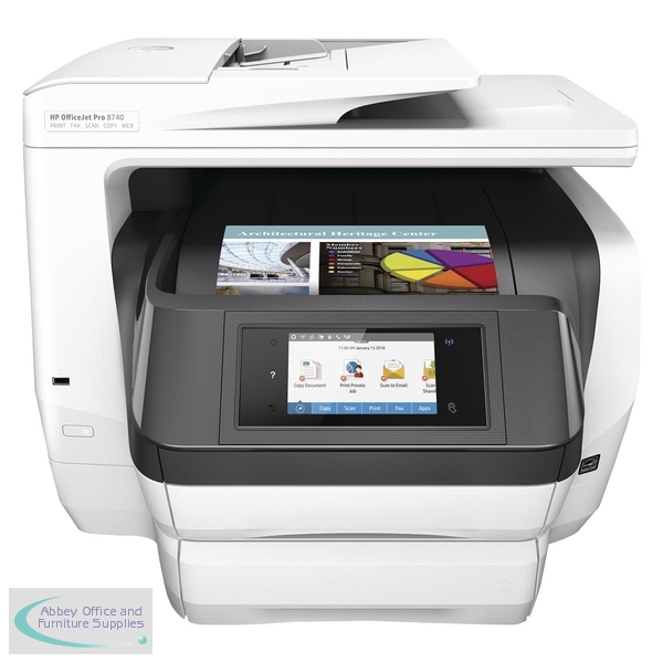 This HP Officejet Pro 8740 All-in-one is a wireless, colour, inkjet printer intergrated with Wi-Fi connectivity. With automatic duplex printing as standard, you can print on both sides of the page to save paper. With a print speed of up to 24 ppm mono 20 ppm colour and first page out as fast as 10 seconds for black and 11 seconds for colour. Print quality, up to 1200 x 1200 dpi, fax resolution 300 x 300 dpi with a transmission speed of 4 seconds per page, copy resolution up to 600 dpi for both mono and colour with a copy speed of up to 22 cpm, scan resolution up to 1200 dpi with a scan speed of 19ipm mono and 8ipm colour. The box contains HP OfficeJet Pro 8740 All-in-one Printer, HP 953 Setup Black OfficeJet Ink Cartridge, HP 953 Setup Cyan OfficeJet Ink Cartridge, HP 953 Setup Magenta OfficeJet Ink Cartridge, HP 953 Setup Yellow OfficeJet Ink Cartridge, 250-sheet Paper Tray, Power cord, Phone cord, Setup poster.