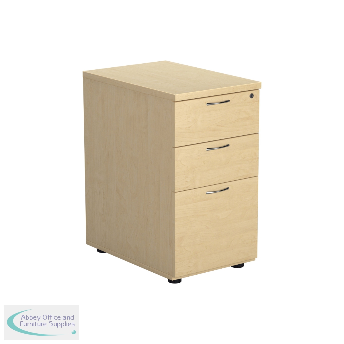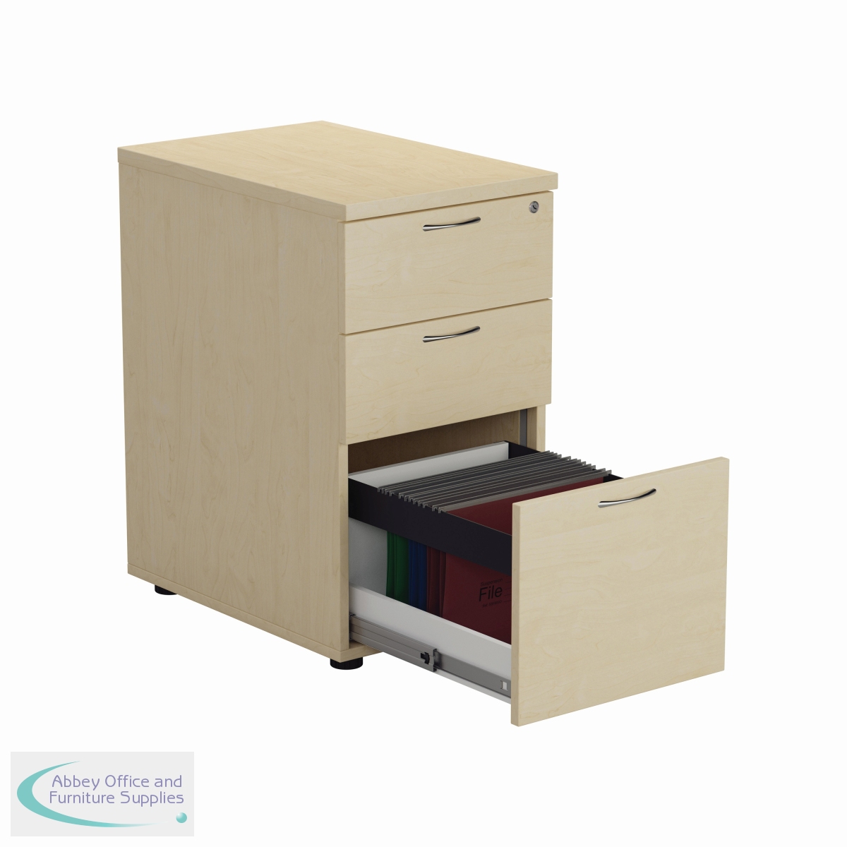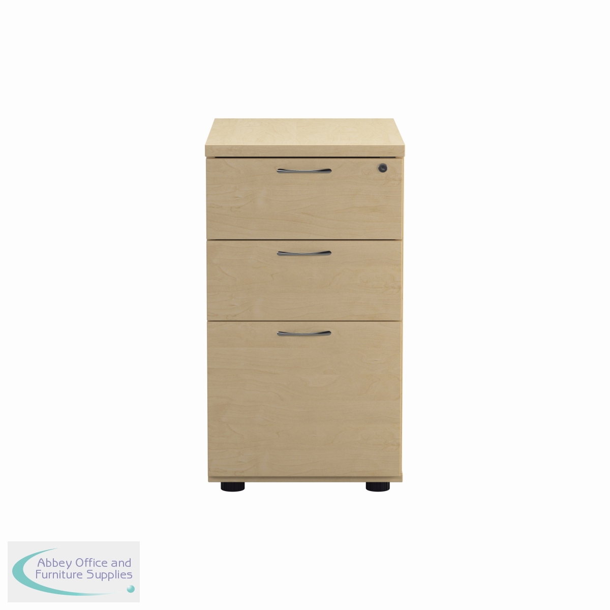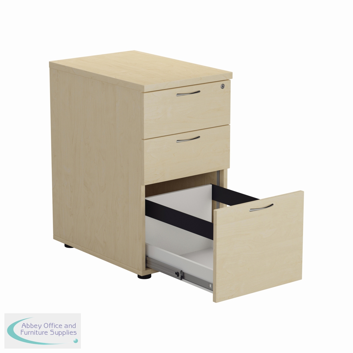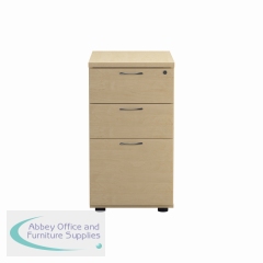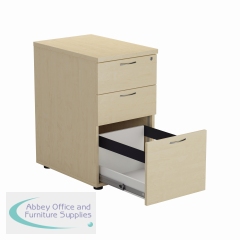 Offering a convenient and flexible place to store documents, papers and stationery, this maple-finish desk high pedestal can fit conveniently next to your desk to provide additional work space. The pedestal features 2 box drawers and 1 filing drawer suitable for foolscap suspension filing. This pedestal measures W404xD600xH730mm and can be placed beside the 600mm end of a radial desk.