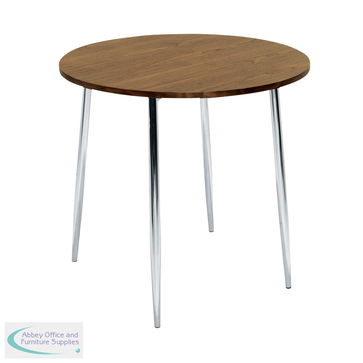 This stylish and sturdy four leg table offers fantastic support and is suited to everyday use. The round table top has an elegant walnut veneer, which is easy to wipe for a quick and efficient clean-up. Four chrome legs provide stability as well as style, with rubber feet on the bottom of each to prevent marks and scratches on the floor. Perfect for breakout areas, this table has an 800mm diameter and is 740mm high.