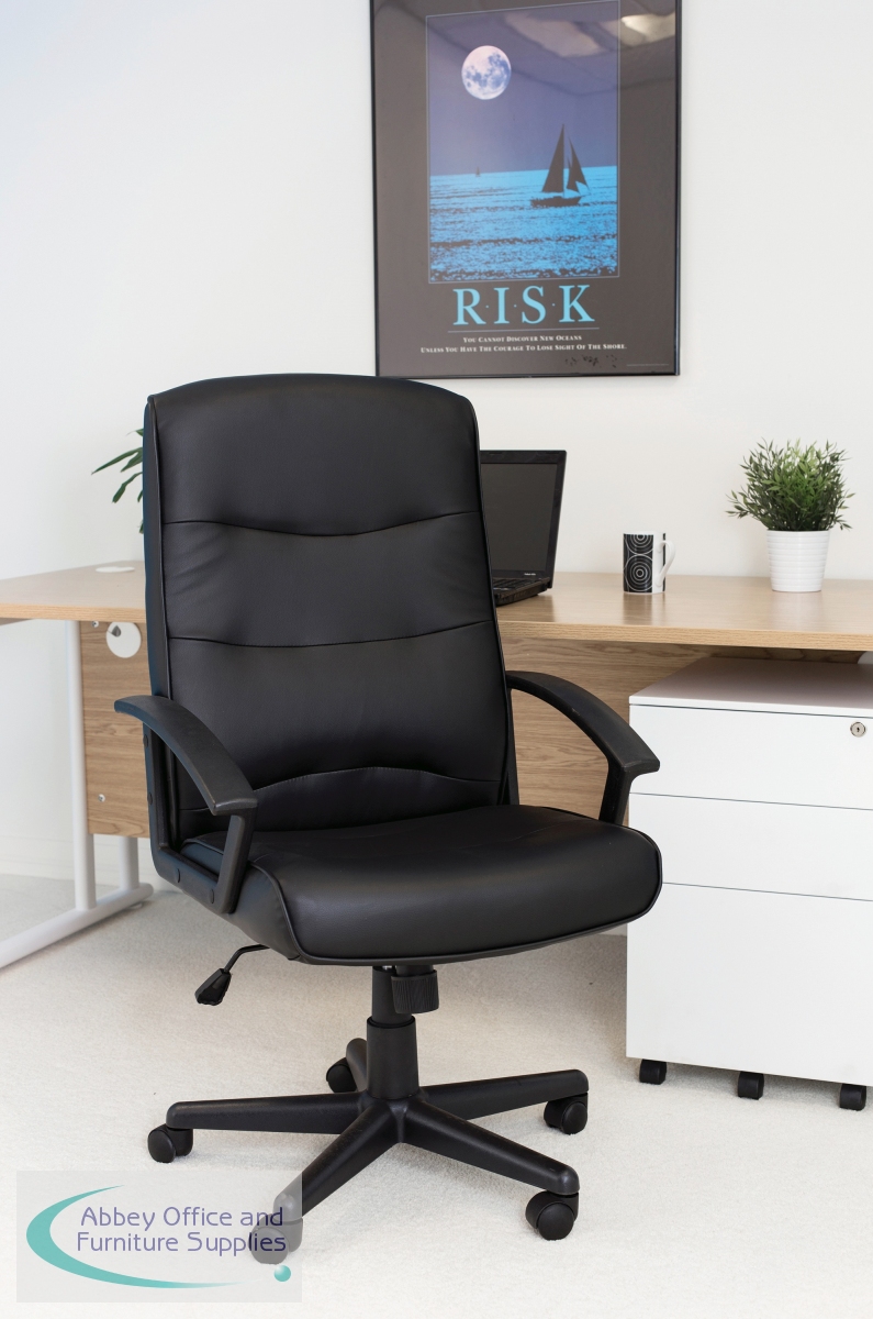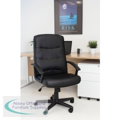 This plush executive chair is upholstered in black leather look material and features a high back for support and comfort. The lock tilt mechanism allows you to adjust the height and angle of the seat via a single lever for comfort for up to 8 hours. This chair comes on a five castor base for mobility.