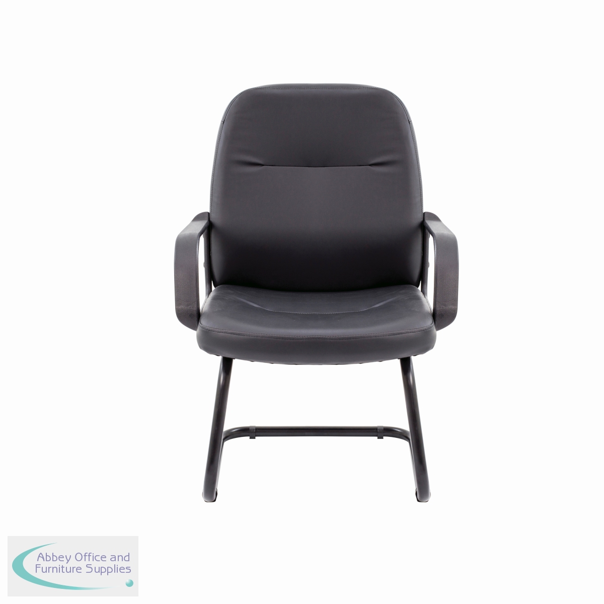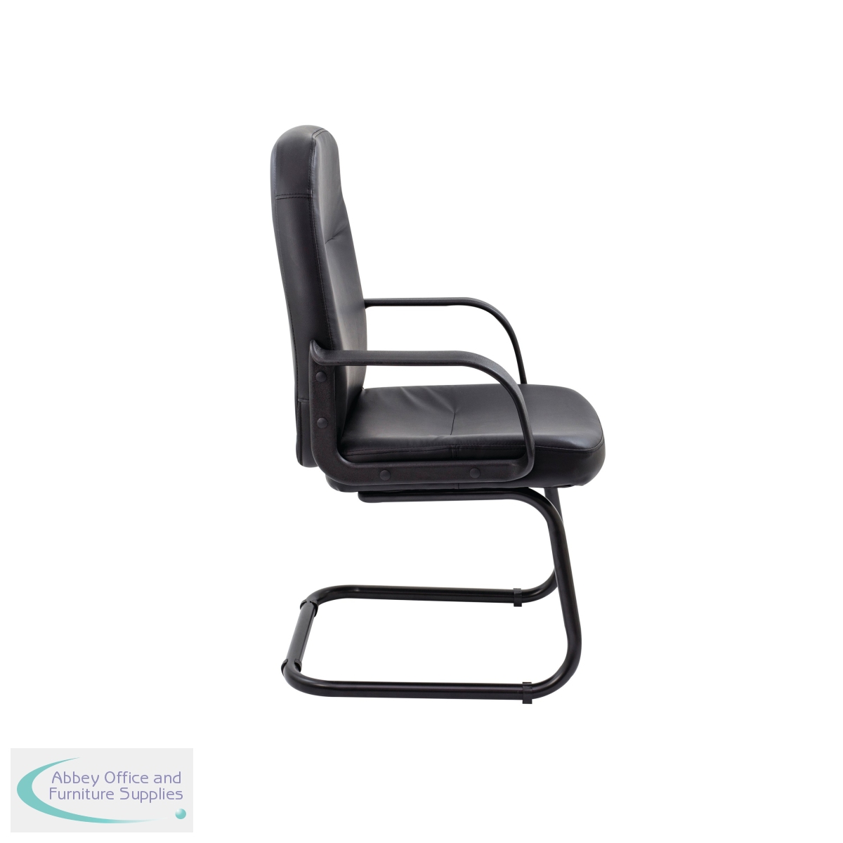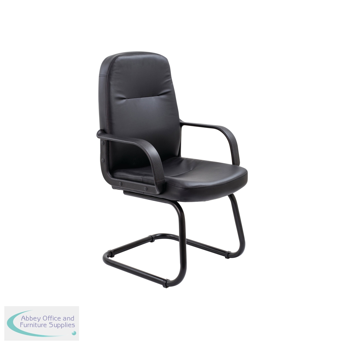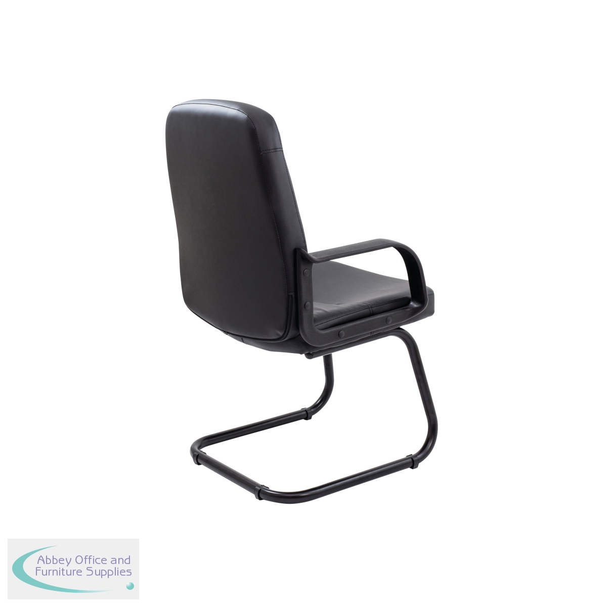 This Jemini Rhone leather look chair is an executive level visitor chair for reception areas, waiting rooms or private offices. The high back and plush padded seat provides comfort for up to 8 hours. Integrated armrests and cantilever legs provide additional support. This high quality chair is upholstered in black leather look material.