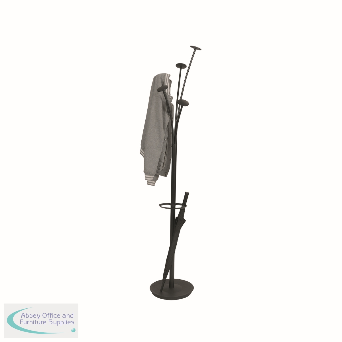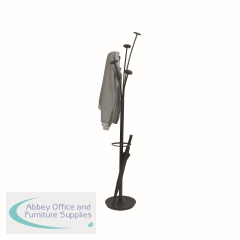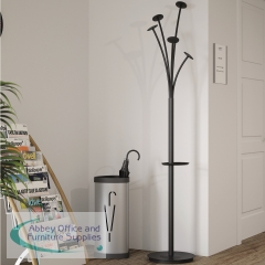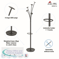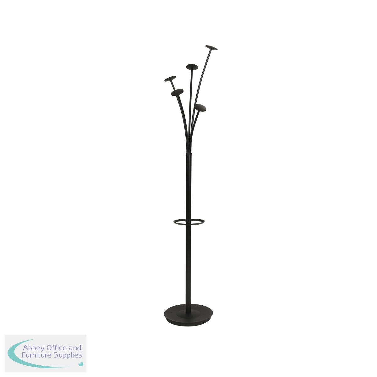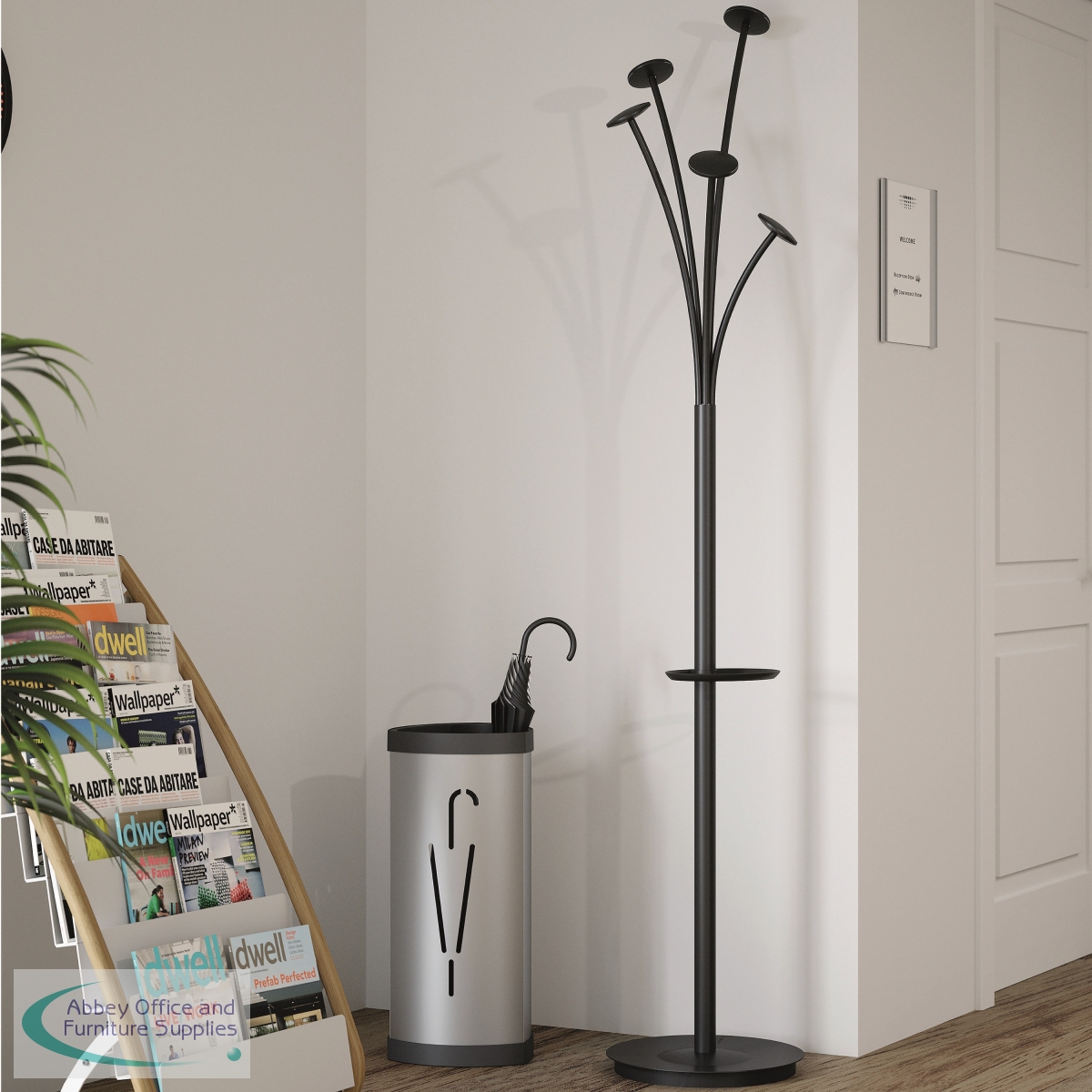 This unique and stylish coat stand from Alba contains 5 hooks of varying lengths and with rounded edges to support a variety of garments. The heavy base provides a high level of stability, even when loaded with garments. The stand includes an integrated umbrella holder and a removable water retainer. The elegant tubular steel stand measures 1870mm in height and is finished in black.