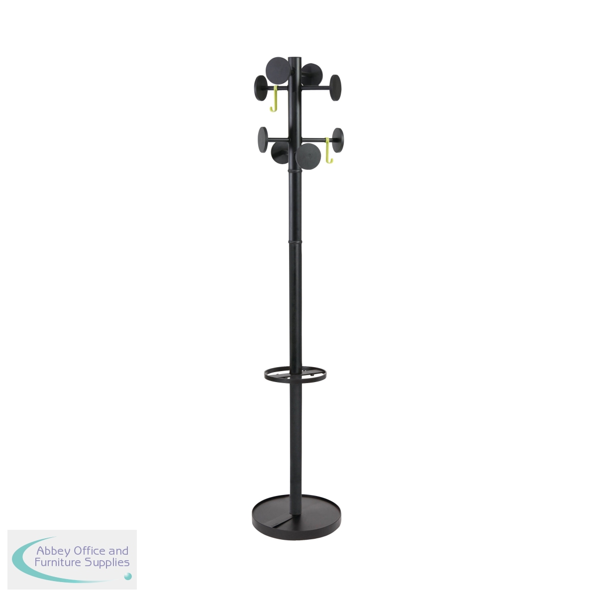 This sturdy and reliable black tubular steel coat stand has eight plastic coat pegs that can be adjusted horizontally for ease of use. It has a heavy base for stability, even when loaded with garments. The coat stand also features an integrated umbrella holder and has a total height of 1750mm.