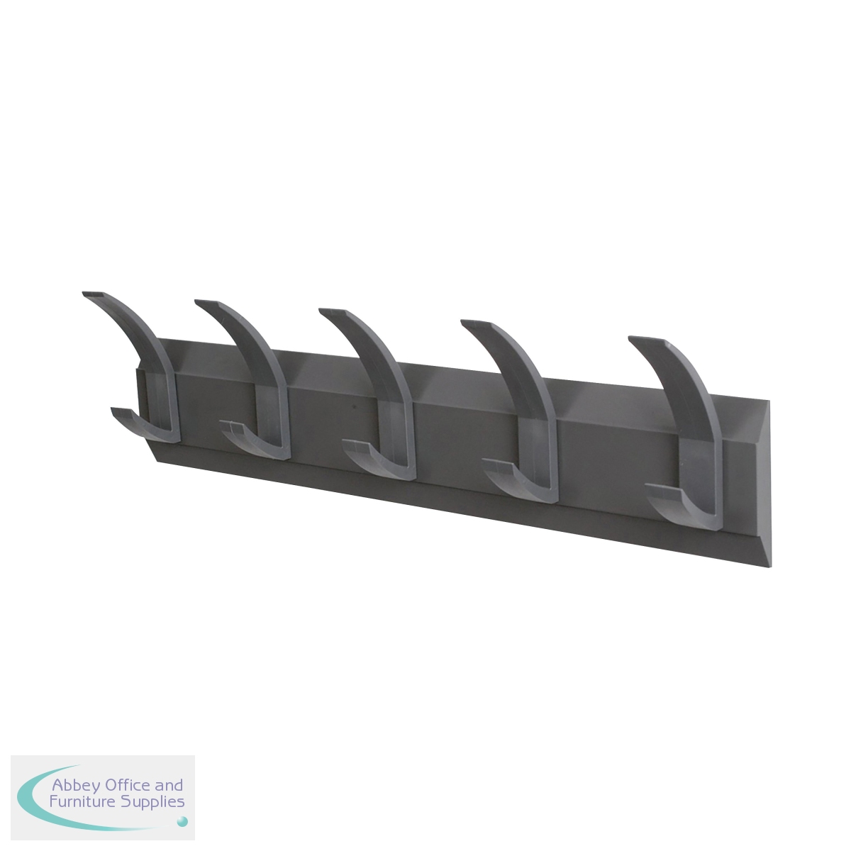 This premium quality coat rack is coated in a textured graphite finish, providing both style and durability. Easily mounted to most wall surfaces with the included mounting kit, the hidden screw and hook fixings create a modern and slimline appearance. This rack contains 5 hooks for use in offices, schools and more.