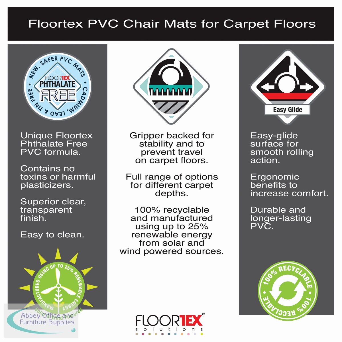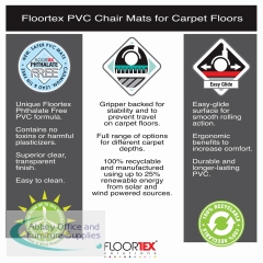 Floortex's Advantagemat's help make your desk work space more ergonomic, by taking strain off of your legs and back, this is done by providing an easy-glide surface. The key reason chair users purchase floor mats is to protect a small or large area of flooring from indentations and scuffs caused by rolling office chairs, along with dirt and spills, therefore extending the life of your surface.
